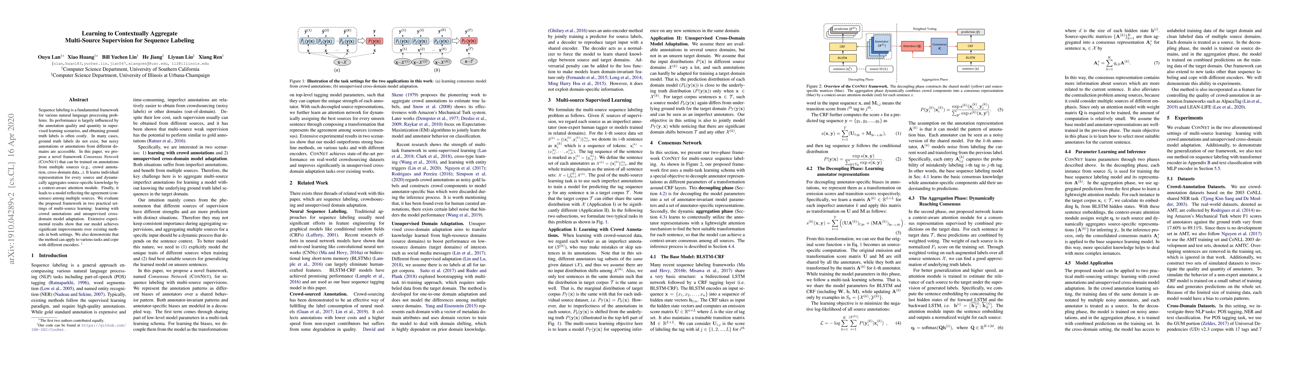 This paper introduces the Consensus Network (ConNet) framework to aggregate multi-source supervision for sequence labeling, dynamically integrating knowledge from various annotations sources through a context-aware attention module. Experimental results show significant improvements over existing methods in crowd annotation and cross-domain adaptation tasks.