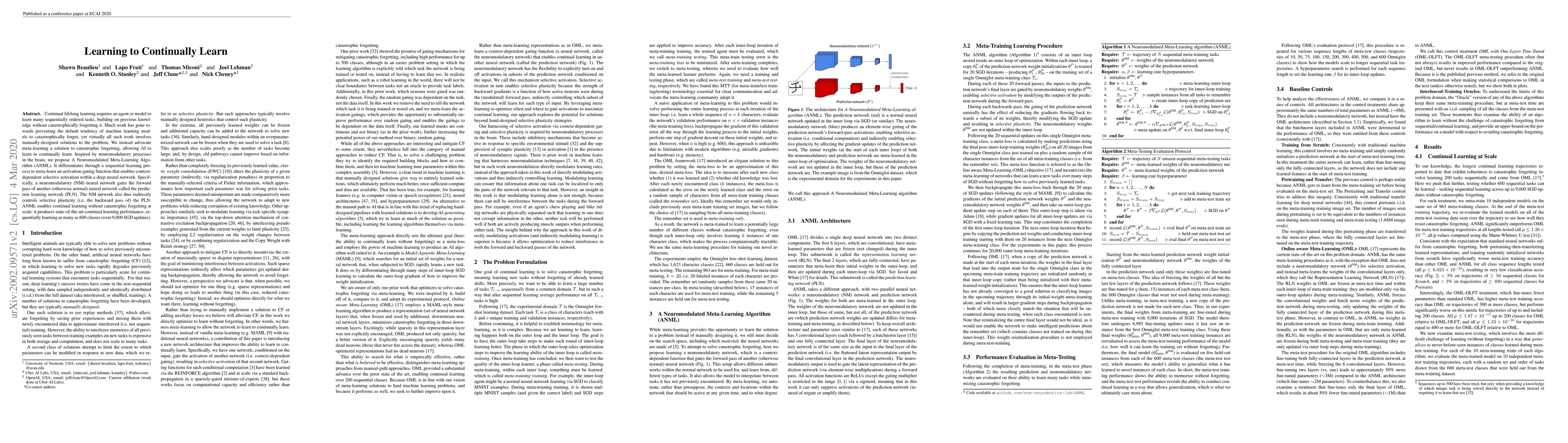 This paper proposes a Neuromodulated Meta-Learning Algorithm (ANML) to enable continual lifelong learning in AI models, addressing the issue of catastrophic forgetting. ANML uses a neuromodulatory neural network to gate the learning process, enabling context-dependent selective activation and plasticity within a prediction learning network, achieving state-of-the-art performance in learning up to 600 classes.
