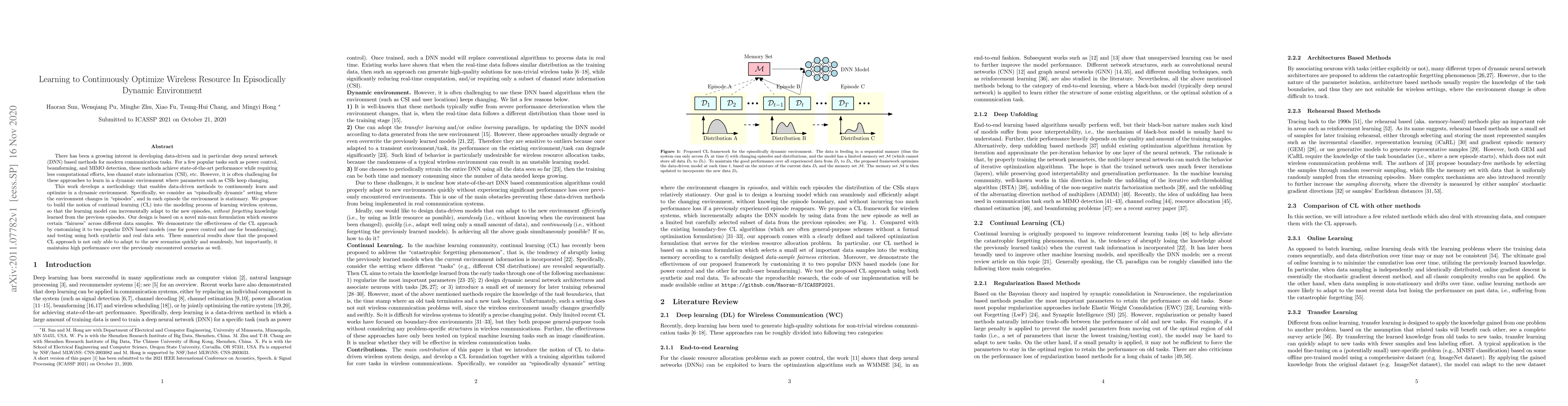 This research introduces a method enabling deep neural network (DNN) based wireless systems to continuously learn and adapt in dynamic environments, dividing the changes into stationary episodes. The approach, based on a novel min-max formulation, ensures models incrementally adapt to new episodes without forgetting previous knowledge. Tested on power control and beamforming models using synthetic and real data, the method showed quick adaptation to new scenarios and maintained high performance on previously encountered scenarios.