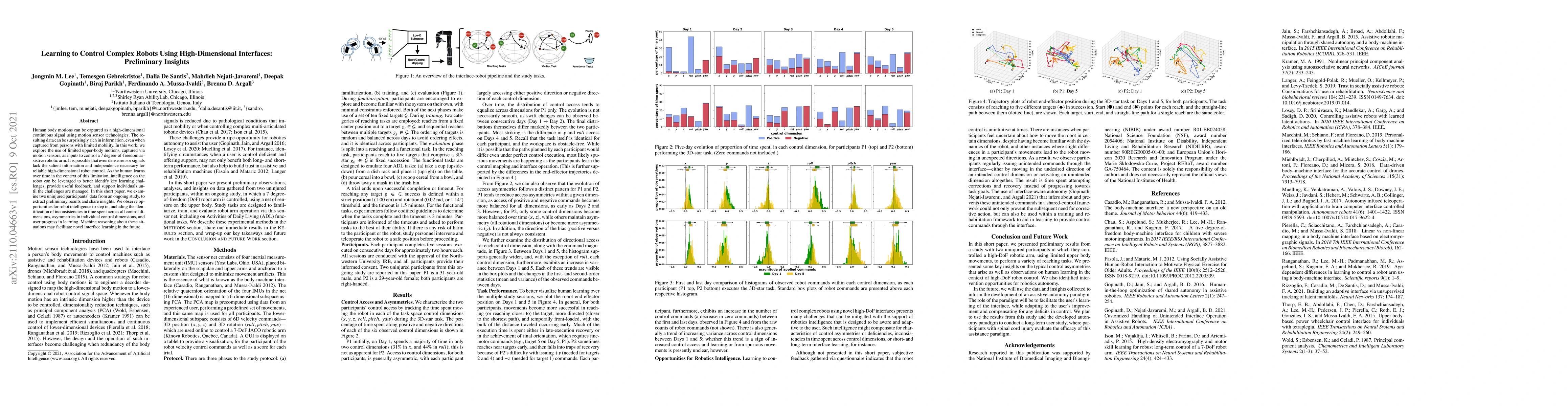 This study explores using limited upper-body human motions, captured via sensors, to control a complex robotic arm. Preliminary findings suggest opportunities for robot intelligence to identify learning challenges and support users, highlighting potential for future interface learning advancements.