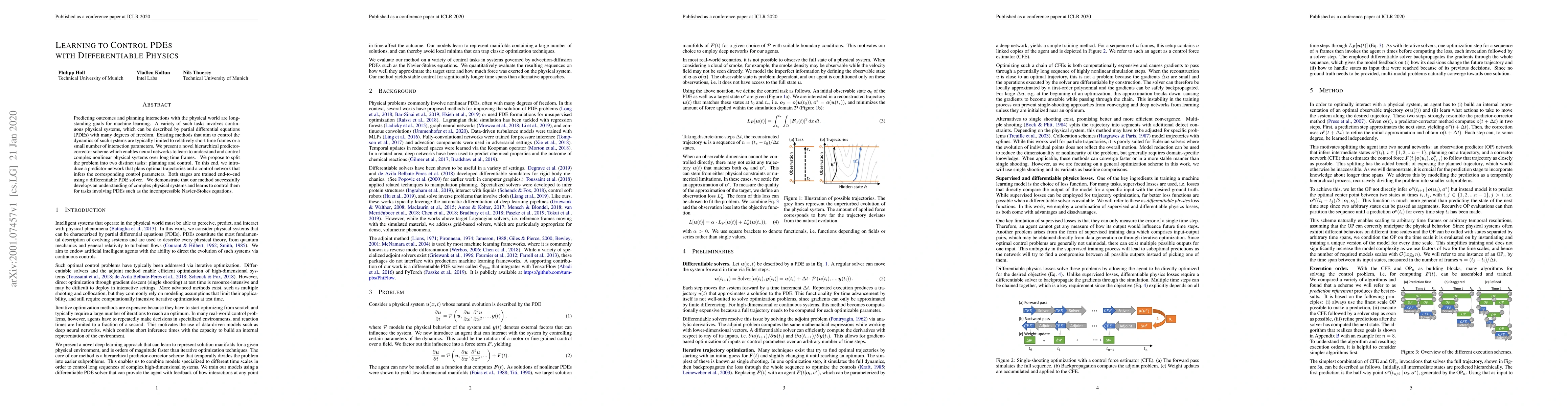 This research introduces a novel method for controlling complex physical systems described by partial differential equations (PDEs) over long periods. It splits the problem into planning trajectories with a predictor network and determining control parameters with a control network, both trained end-to-end using a differentiable PDE solver. The method successfully demonstrates control of incompressible Navier-Stokes equations.