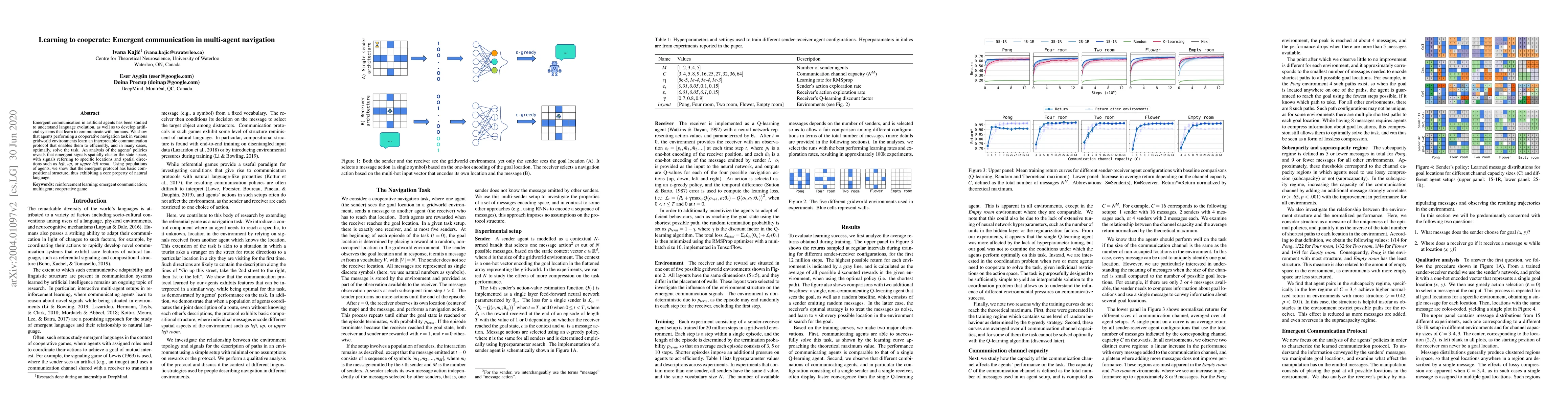 This paper demonstrates that artificial agents navigating cooperative tasks develop an interpretable communication protocol, enabling efficient task completion. The emergent signals spatially cluster the state space, indicating specific locations and directions, and show a basic compositional structure akin to natural language.