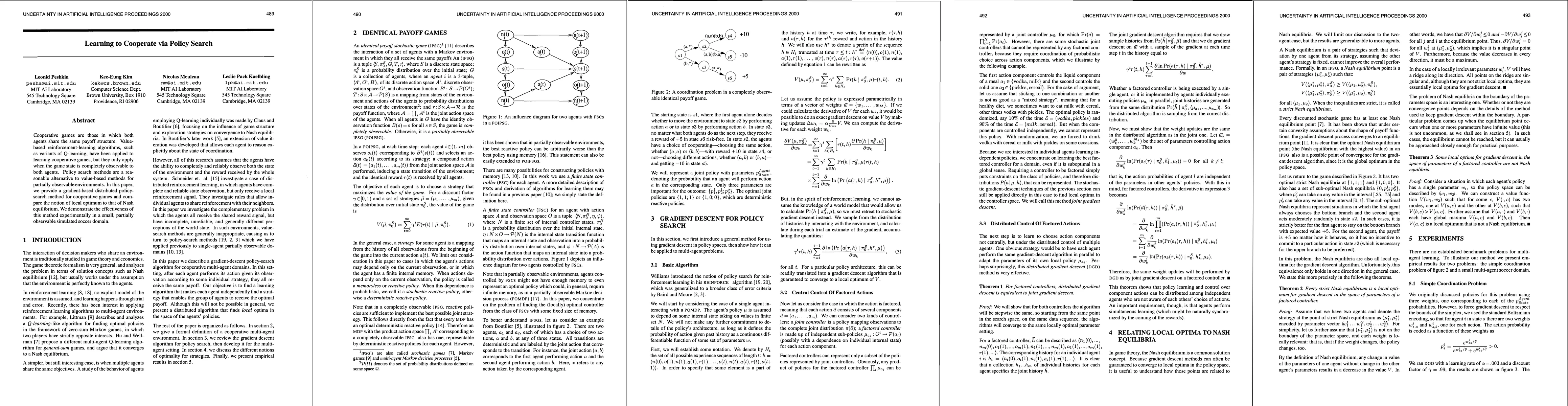 The paper introduces a gradient-based distributed policy-search method for cooperative games, proving that distributed gradient descent is equivalent to joint gradient descent for factored controllers, and demonstrates its effectiveness in a simulated soccer domain.