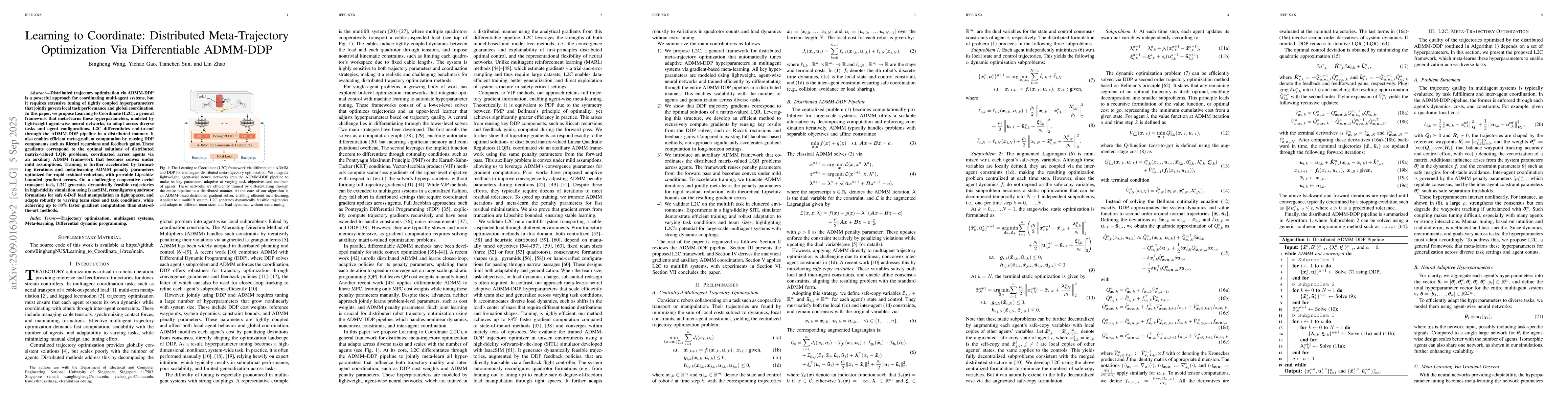 Distributed trajectory optimization via ADMM-DDP is a powerful approach for coordinating multi-agent systems, but it requires extensive tuning of tightly coupled hyperparameters that jointly govern local task performance and global coordination. In this paper, we propose Learning to Coordinate (L2C), a general framework that meta-learns these hyperparameters, modeled by lightweight agent-wise neural networks, to adapt across diverse tasks and agent configurations. L2C differentiates end-to-end through the ADMM-DDP pipeline in a distributed manner. It also enables efficient meta-gradient computation by reusing DDP components such as Riccati recursions and feedback gains. These gradients correspond to the optimal solutions of distributed matrix-valued LQR problems, coordinated across agents via an auxiliary ADMM framework that becomes convex under mild assumptions. Training is further accelerated by truncating iterations and meta-learning ADMM penalty parameters optimized for rapid residual reduction, with provable Lipschitz-bounded gradient errors. On a challenging cooperative aerial transport task, L2C generates dynamically feasible trajectories in high-fidelity simulation using IsaacSIM, reconfigures quadrotor formations for safe 6-DoF load manipulation in tight spaces, and adapts robustly to varying team sizes and task conditions, while achieving up to $88\%$ faster gradient computation than state-of-the-art methods.