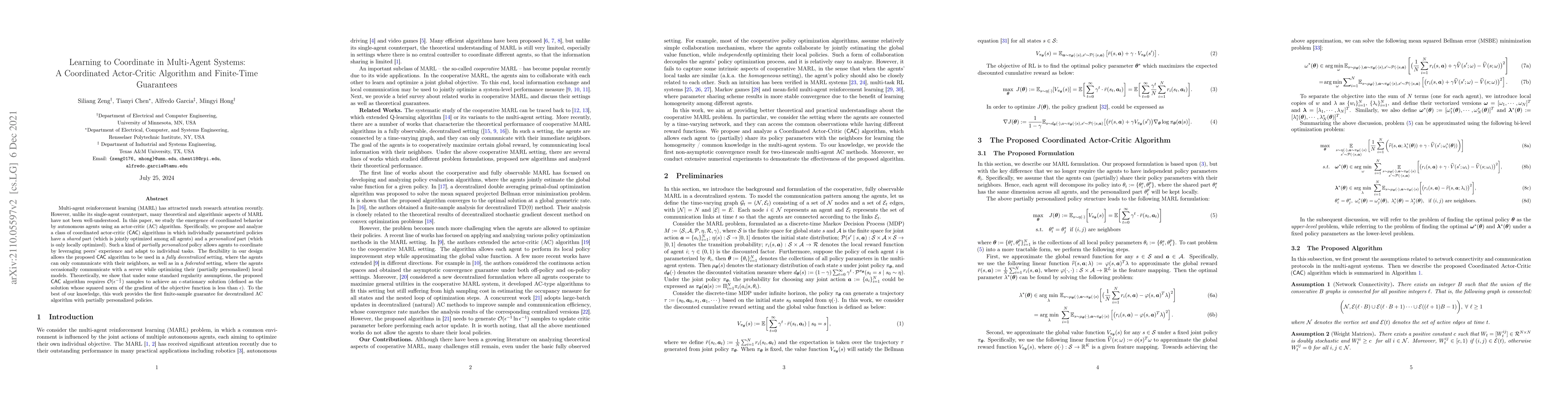Multi-agent reinforcement learning (MARL) has attracted much research attention recently. However, unlike its single-agent counterpart, many theoretical and algorithmic aspects of MARL have not been well-understood. In this paper, we study the emergence of coordinated behavior by autonomous agents using an actor-critic (AC) algorithm. Specifically, we propose and analyze a class of coordinated actor-critic algorithms (CAC) in which individually parametrized policies have a {\it shared} part (which is jointly optimized among all agents) and a {\it personalized} part (which is only locally optimized). Such kind of {\it partially personalized} policy allows agents to learn to coordinate by leveraging peers' past experience and adapt to individual tasks. The flexibility in our design allows the proposed MARL-CAC algorithm to be used in a {\it fully decentralized} setting, where the agents can only communicate with their neighbors, as well as a {\it federated} setting, where the agents occasionally communicate with a server while optimizing their (partially personalized) local models. Theoretically, we show that under some standard regularity assumptions, the proposed MARL-CAC algorithm requires $\mathcal{O}(\epsilon^{-\frac{5}{2}})$ samples to achieve an $\epsilon$-stationary solution (defined as the solution whose squared norm of the gradient of the objective function is less than $\epsilon$). To the best of our knowledge, this work provides the first finite-sample guarantee for decentralized AC algorithm with partially personalized policies.