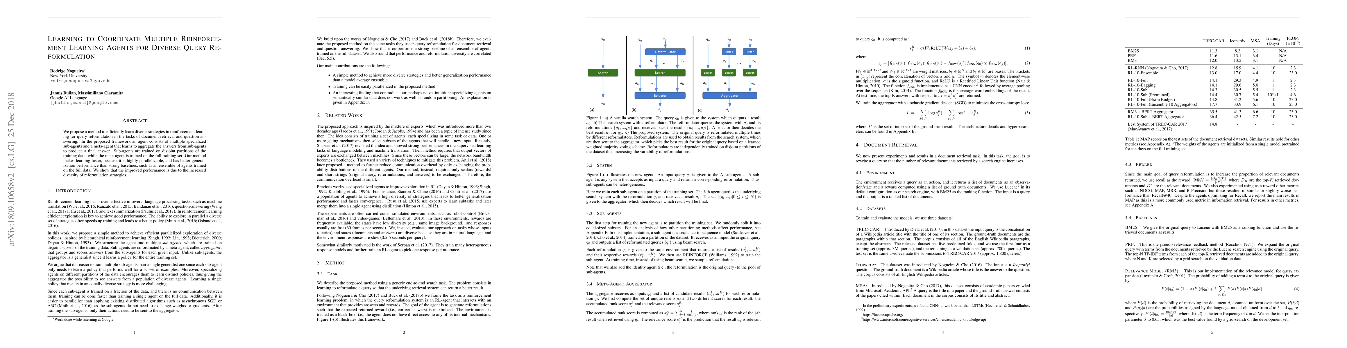 We propose a method to efficiently learn diverse strategies in reinforcement learning for query reformulation in the tasks of document retrieval and question answering. In the proposed framework an agent consists of multiple specialized sub-agents and a meta-agent that learns to aggregate the answers from sub-agents to produce a final answer. Sub-agents are trained on disjoint partitions of the training data, while the meta-agent is trained on the full training set. Our method makes learning faster, because it is highly parallelizable, and has better generalization performance than strong baselines, such as an ensemble of agents trained on the full data. We show that the improved performance is due to the increased diversity of reformulation strategies.