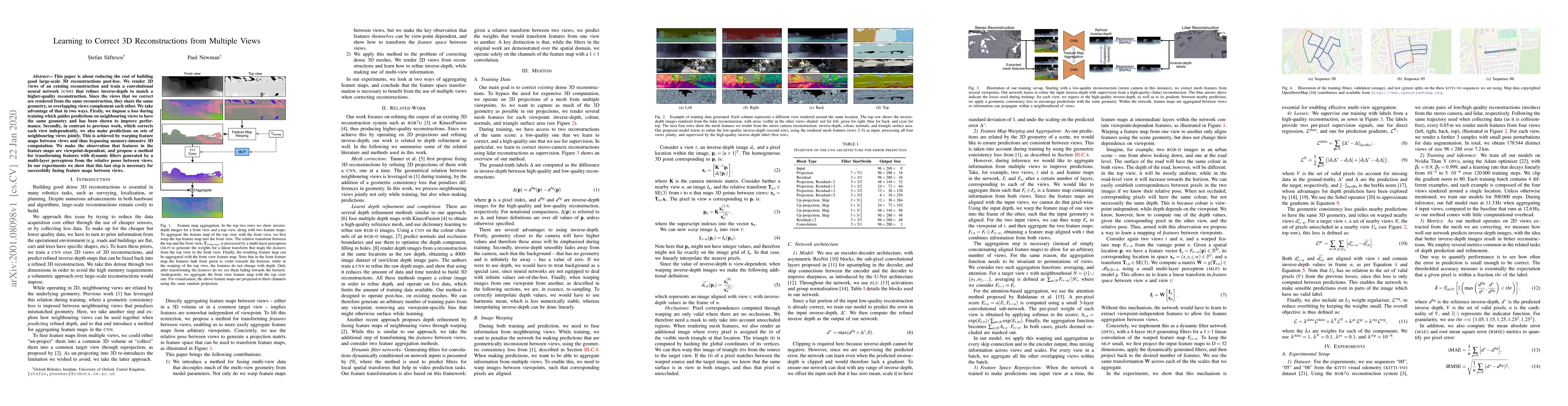 This paper proposes a method to refine large-scale 3D reconstructions post-hoc using a CNN that corrects inverse-depth parameters by leveraging overlapping 2D views. It improves performance by jointly predicting sets of neighboring views and transforming viewpoint-dependent features with dynamic filters.