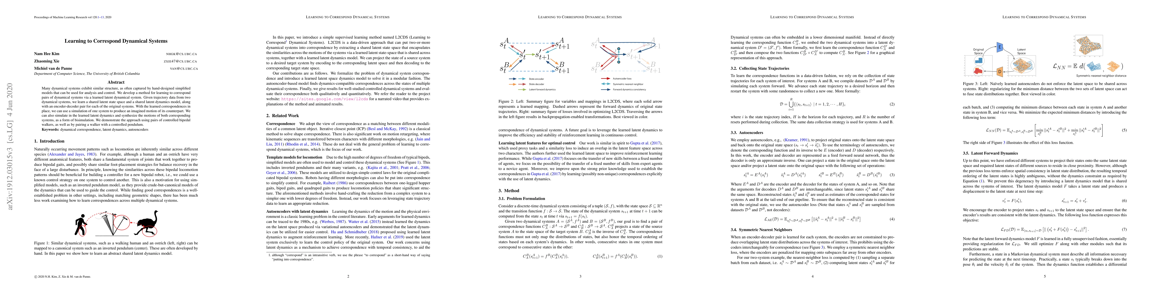 Many dynamical systems exhibit similar structure, as often captured by hand-designed simplified models that can be used for analysis and control. We develop a method for learning to correspond pairs of dynamical systems via a learned latent dynamical system. Given trajectory data from two dynamical systems, we learn a shared latent state space and a shared latent dynamics model, along with an encoder-decoder pair for each of the original systems. With the learned correspondences in place, we can use a simulation of one system to produce an imagined motion of its counterpart. We can also simulate in the learned latent dynamics and synthesize the motions of both corresponding systems, as a form of bisimulation. We demonstrate the approach using pairs of controlled bipedal walkers, as well as by pairing a walker with a controlled pendulum.