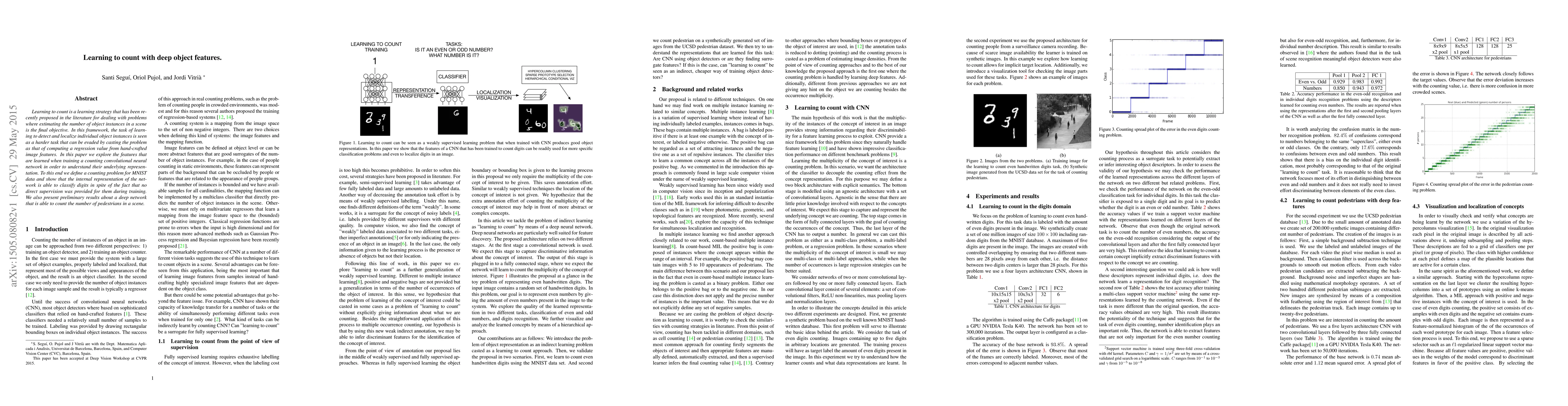 Learning to count is a learning strategy that has been recently proposed in the literature for dealing with problems where estimating the number of object instances in a scene is the final objective. In this framework, the task of learning to detect and localize individual object instances is seen as a harder task that can be evaded by casting the problem as that of computing a regression value from hand-crafted image features. In this paper we explore the features that are learned when training a counting convolutional neural network in order to understand their underlying representation. To this end we define a counting problem for MNIST data and show that the internal representation of the network is able to classify digits in spite of the fact that no direct supervision was provided for them during training. We also present preliminary results about a deep network that is able to count the number of pedestrians in a scene.