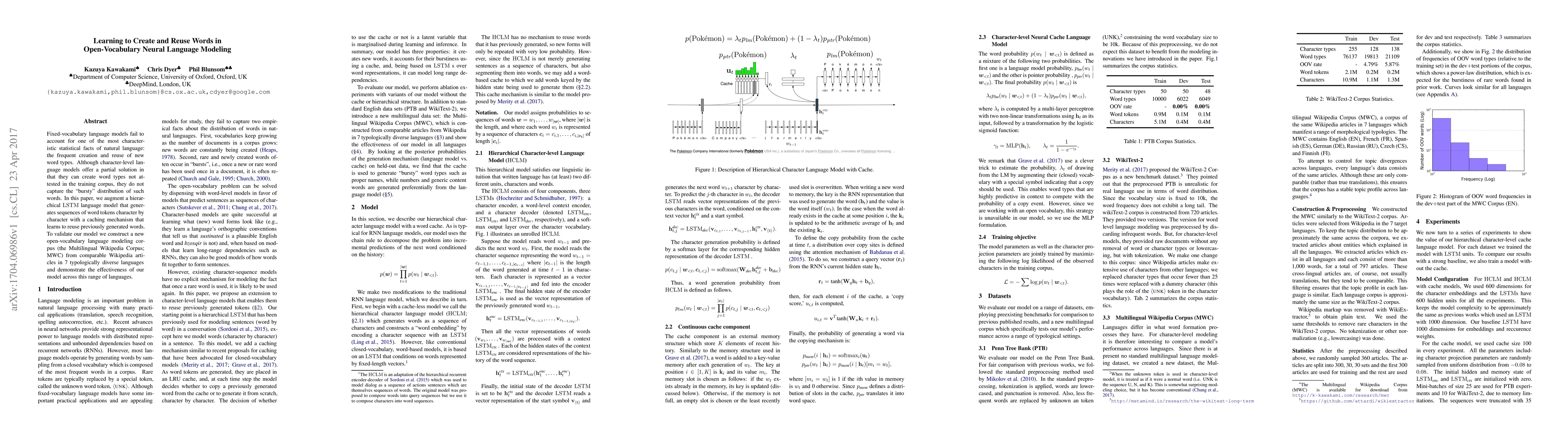 This paper proposes an augmented hierarchical LSTM model with a caching mechanism to generate and reuse new word types in open-vocabulary neural language modeling. It validates the model using a newly constructed Multilingual Wikipedia Corpus (MWC) and demonstrates its effectiveness across diverse languages.
