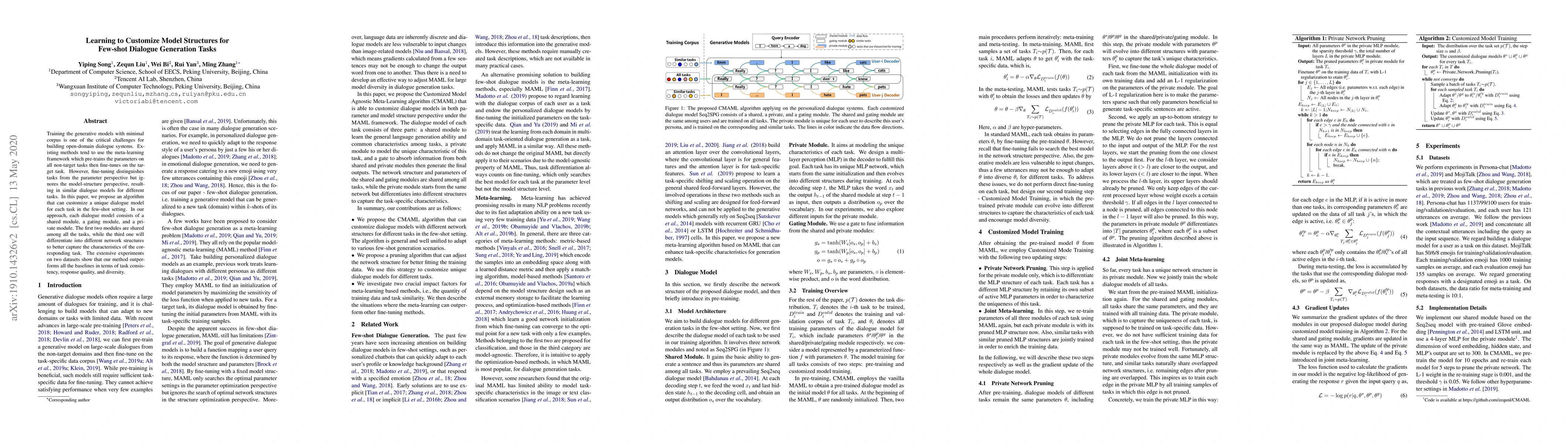 Training the generative models with minimal corpus is one of the critical challenges for building open-domain dialogue systems. Existing methods tend to use the meta-learning framework which pre-trains the parameters on all non-target tasks then fine-tunes on the target task. However, fine-tuning distinguishes tasks from the parameter perspective but ignores the model-structure perspective, resulting in similar dialogue models for different tasks. In this paper, we propose an algorithm that can customize a unique dialogue model for each task in the few-shot setting. In our approach, each dialogue model consists of a shared module, a gating module, and a private module. The first two modules are shared among all the tasks, while the third one will differentiate into different network structures to better capture the characteristics of the corresponding task. The extensive experiments on two datasets show that our method outperforms all the baselines in terms of task consistency, response quality, and diversity.