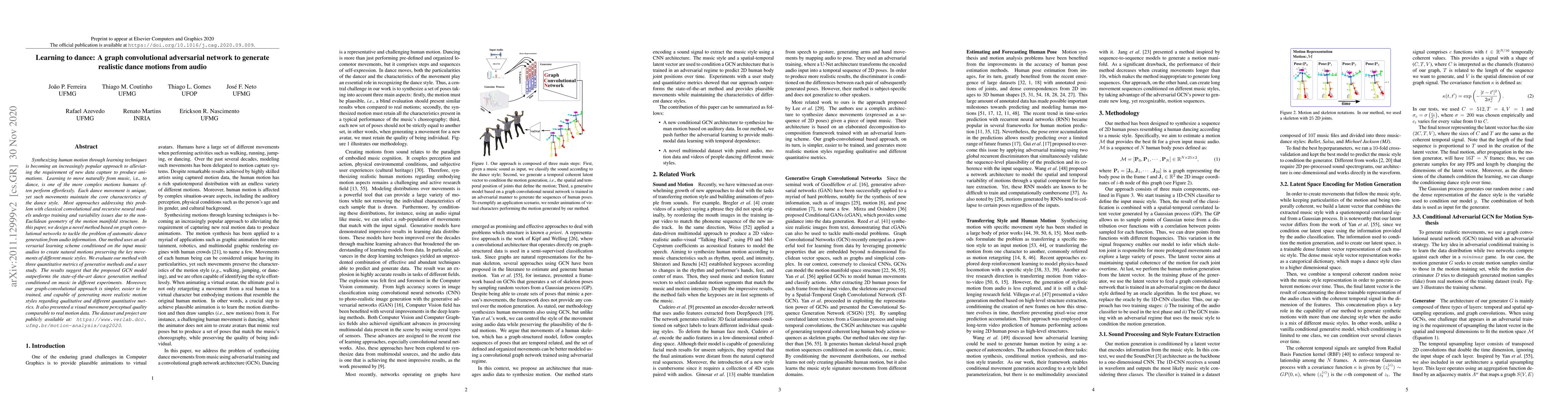 This paper proposes a graph convolutional adversarial network to generate realistic dance motions from audio, addressing the challenge of synthesizing natural dance movements. The method outperforms existing techniques in generating more realistic and style-preserving dance motions, as demonstrated by quantitative metrics and user studies.