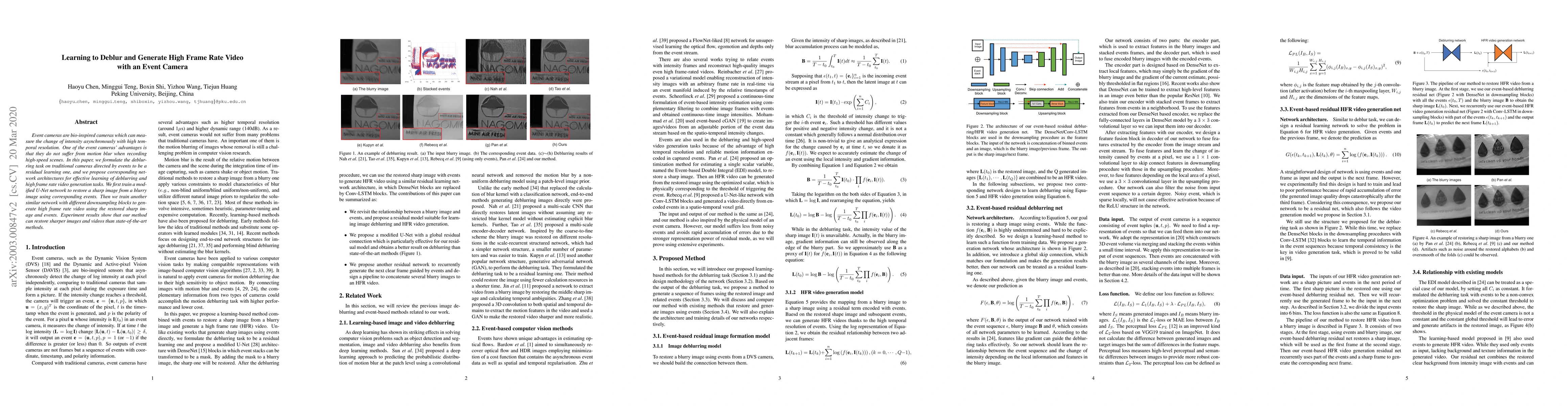 This paper proposes a method to deblur images and generate high frame rate videos using event cameras, which measure intensity changes asynchronously. It employs a modified U-Net for deblurring and another network for high frame rate video generation, achieving superior results compared to existing techniques.