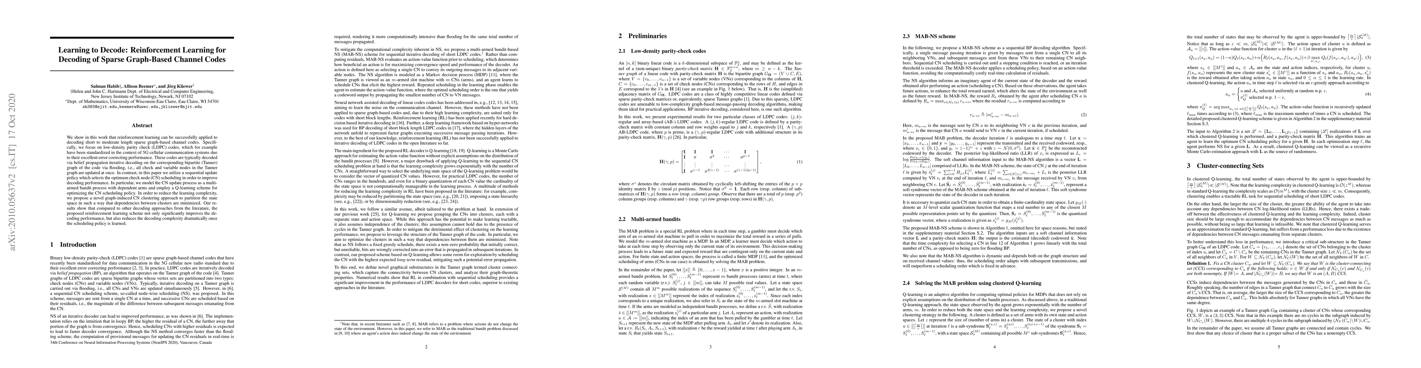 This paper explores the application of reinforcement learning to decode sparse graph-based channel codes, specifically focusing on low-density parity check (LDPC) codes. It proposes a Q-learning scheme for optimizing check node scheduling and introduces a graph-induced clustering approach to reduce learning complexity, achieving better decoding performance and lower complexity compared to traditional methods.