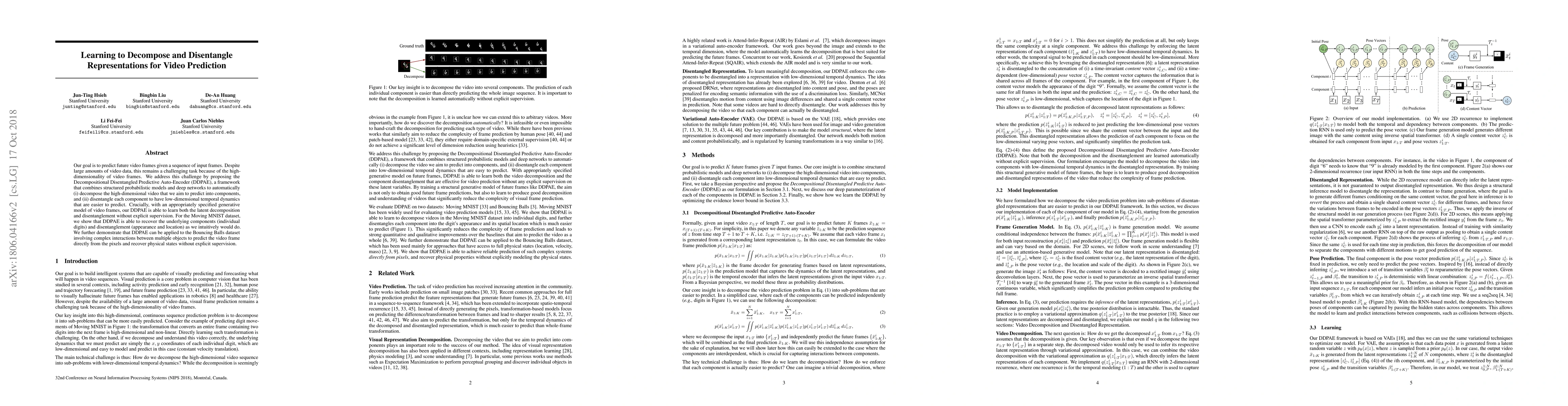 This paper proposes the Decompositional Disentangled Predictive Auto-Encoder (DDPAE) to predict future video frames by decomposing and disentangling high-dimensional video data into manageable components with low-dimensional temporal dynamics. DDPAE learns latent decomposition and disentanglement without explicit supervision, demonstrated effectively on Moving MNIST and Bouncing Balls datasets.