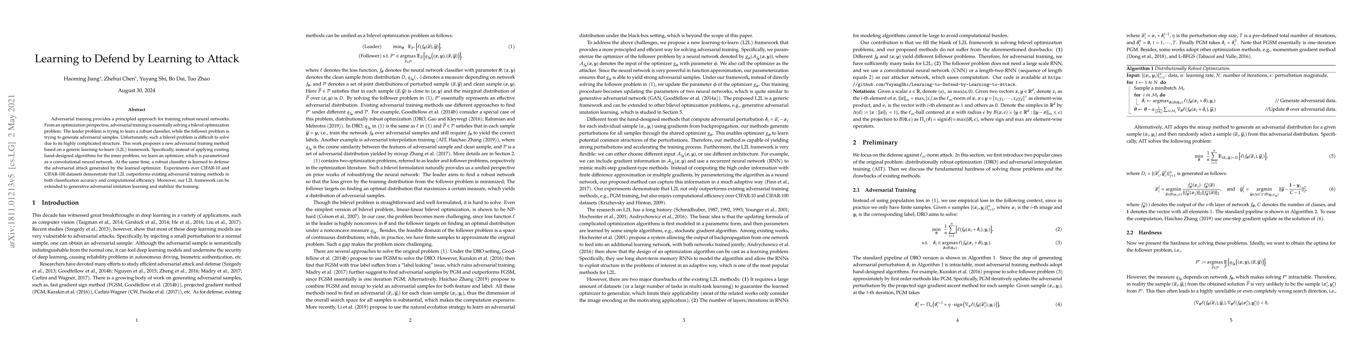 Adversarial training provides a principled approach for training robust neural networks. From an optimization perspective, adversarial training is essentially solving a bilevel optimization problem. The leader problem is trying to learn a robust classifier, while the follower problem is trying to generate adversarial samples. Unfortunately, such a bilevel problem is difficult to solve due to its highly complicated structure. This work proposes a new adversarial training method based on a generic learning-to-learn (L2L) framework. Specifically, instead of applying existing hand-designed algorithms for the inner problem, we learn an optimizer, which is parametrized as a convolutional neural network. At the same time, a robust classifier is learned to defense the adversarial attack generated by the learned optimizer. Experiments over CIFAR-10 and CIFAR-100 datasets demonstrate that L2L outperforms existing adversarial training methods in both classification accuracy and computational efficiency. Moreover, our L2L framework can be extended to generative adversarial imitation learning and stabilize the training.