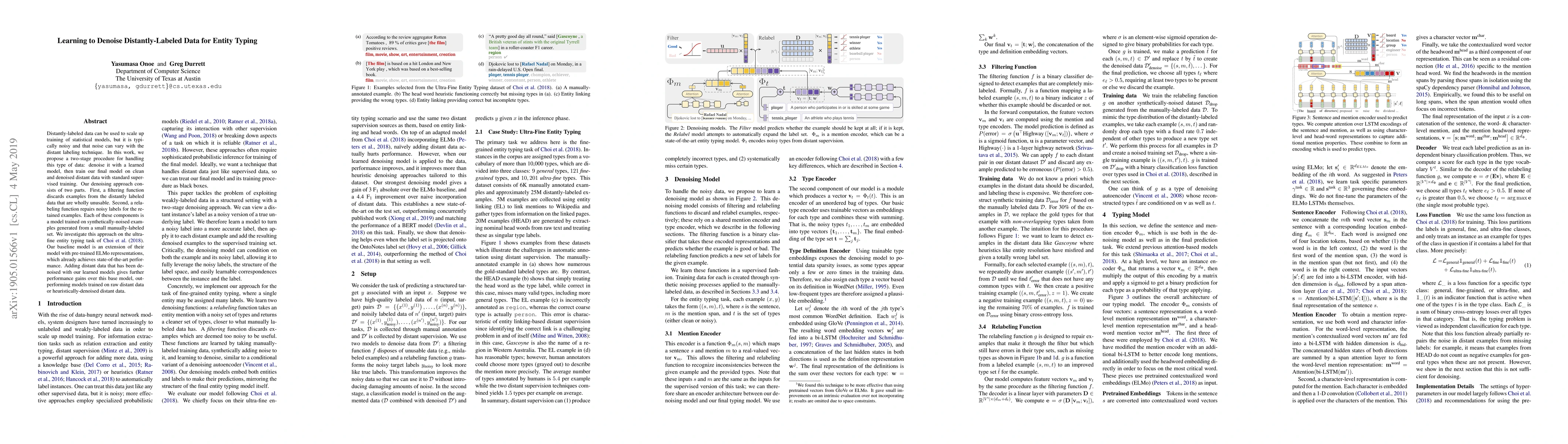 This paper proposes a two-stage denoising procedure for distantly-labeled data to improve entity typing performance. The method involves filtering unusable examples and relabeling noisy ones, both trained on synthetic noise. The approach outperforms baselines by integrating denoised distant data into the training process.