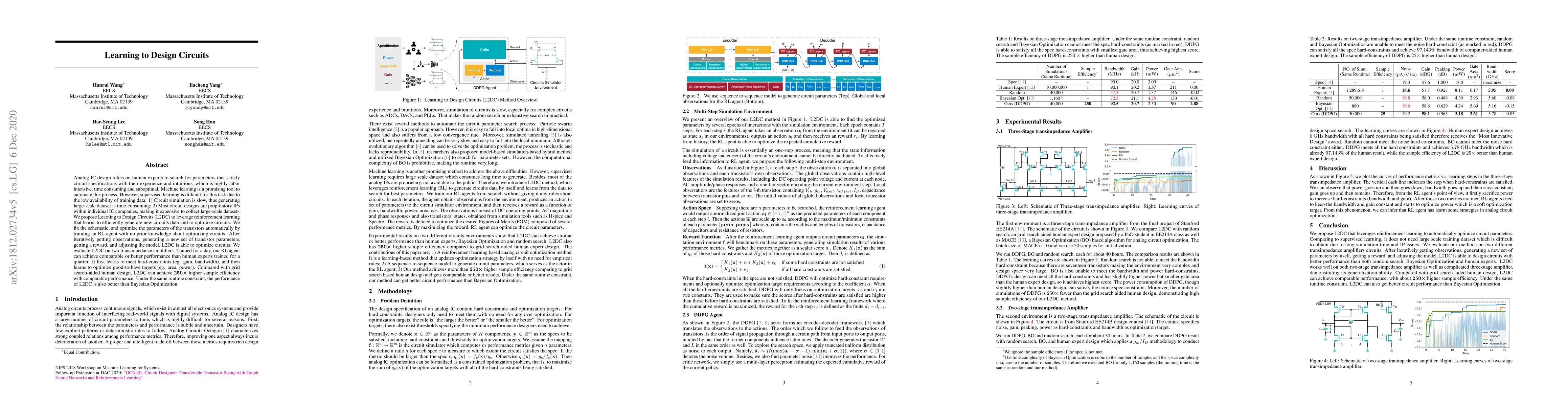 The paper proposes "Learning to Design Circuits" (L2DC), a reinforcement learning approach to automate analog IC design, addressing the labor-intensive and suboptimal nature of current human-expert methods. L2DC optimizes transistor parameters without prior knowledge, achieving comparable or better performance than human experts in a fraction of the time.