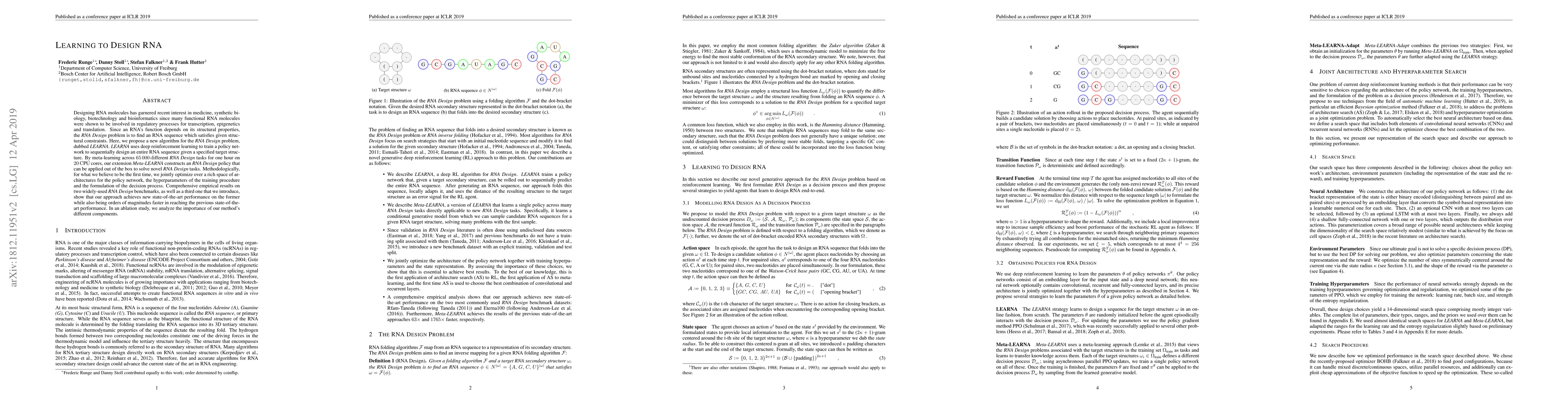 Designing RNA molecules has garnered recent interest in medicine, synthetic biology, biotechnology and bioinformatics since many functional RNA molecules were shown to be involved in regulatory processes for transcription, epigenetics and translation. Since an RNA's function depends on its structural properties, the RNA Design problem is to find an RNA sequence which satisfies given structural constraints. Here, we propose a new algorithm for the RNA Design problem, dubbed LEARNA. LEARNA uses deep reinforcement learning to train a policy network to sequentially design an entire RNA sequence given a specified target structure. By meta-learning across 65000 different RNA Design tasks for one hour on 20 CPU cores, our extension Meta-LEARNA constructs an RNA Design policy that can be applied out of the box to solve novel RNA Design tasks. Methodologically, for what we believe to be the first time, we jointly optimize over a rich space of architectures for the policy network, the hyperparameters of the training procedure and the formulation of the decision process. Comprehensive empirical results on two widely-used RNA Design benchmarks, as well as a third one that we introduce, show that our approach achieves new state-of-the-art performance on the former while also being orders of magnitudes faster in reaching the previous state-of-the-art performance. In an ablation study, we analyze the importance of our method's different components.