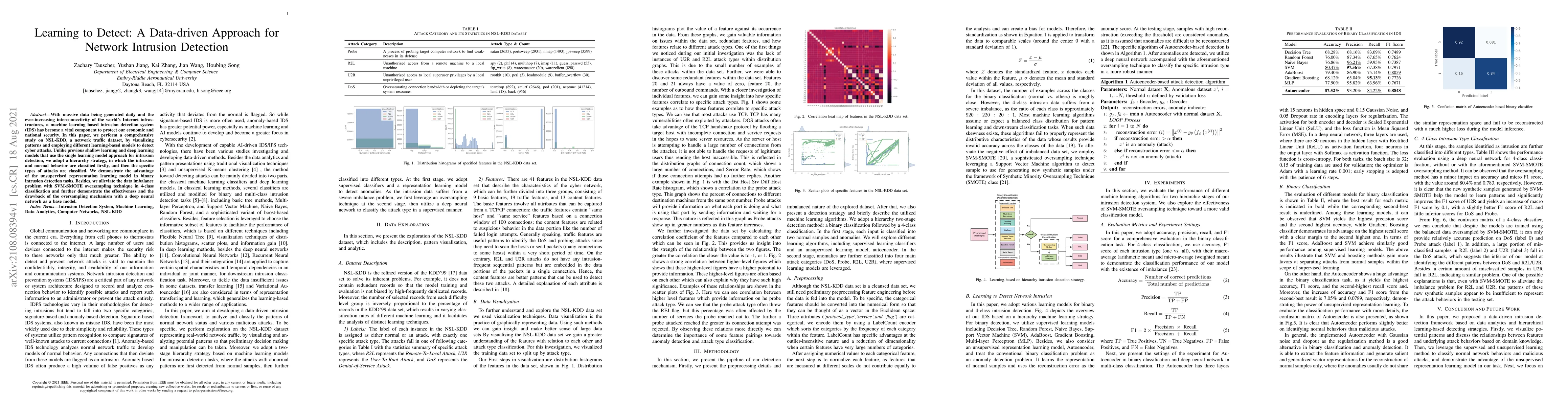 With massive data being generated daily and the ever-increasing interconnectivity of the world's Internet infrastructures, a machine learning based intrusion detection system (IDS) has become a vital component to protect our economic and national security. In this paper, we perform a comprehensive study on NSL-KDD, a network traffic dataset, by visualizing patterns and employing different learning-based models to detect cyber attacks. Unlike previous shallow learning and deep learning models that use the single learning model approach for intrusion detection, we adopt a hierarchy strategy, in which the intrusion and normal behavior are classified firstly, and then the specific types of attacks are classified. We demonstrate the advantage of the unsupervised representation learning model in binary intrusion detection tasks. Besides, we alleviate the data imbalance problem with SVM-SMOTE oversampling technique in 4-class classification and further demonstrate the effectiveness and the drawback of the oversampling mechanism with a deep neural network as a base model.