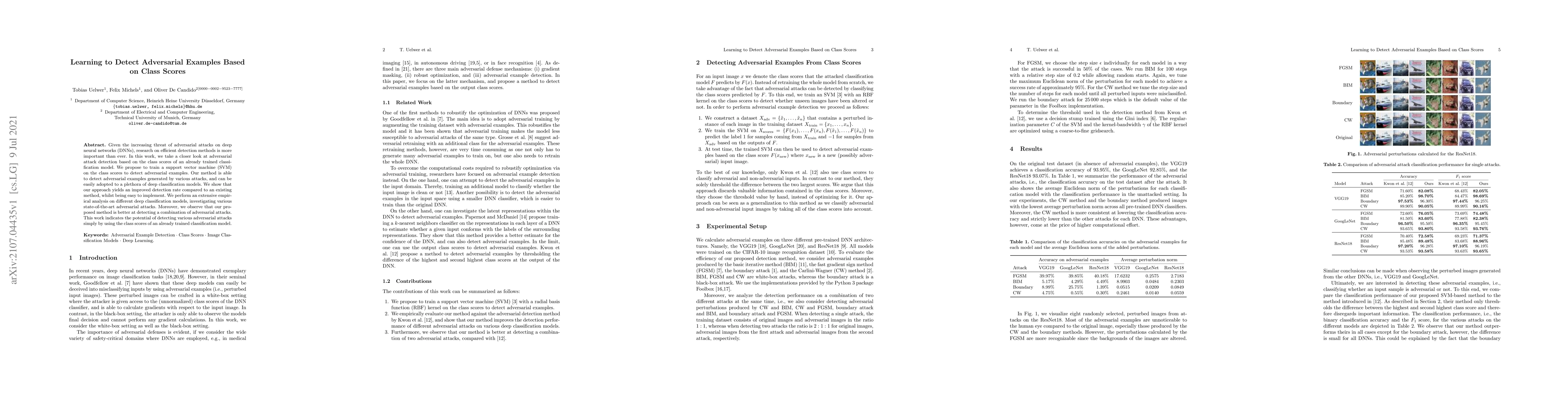 Given the increasing threat of adversarial attacks on deep neural networks (DNNs), research on efficient detection methods is more important than ever. In this work, we take a closer look at adversarial attack detection based on the class scores of an already trained classification model. We propose to train a support vector machine (SVM) on the class scores to detect adversarial examples. Our method is able to detect adversarial examples generated by various attacks, and can be easily adopted to a plethora of deep classification models. We show that our approach yields an improved detection rate compared to an existing method, whilst being easy to implement. We perform an extensive empirical analysis on different deep classification models, investigating various state-of-the-art adversarial attacks. Moreover, we observe that our proposed method is better at detecting a combination of adversarial attacks. This work indicates the potential of detecting various adversarial attacks simply by using the class scores of an already trained classification model.