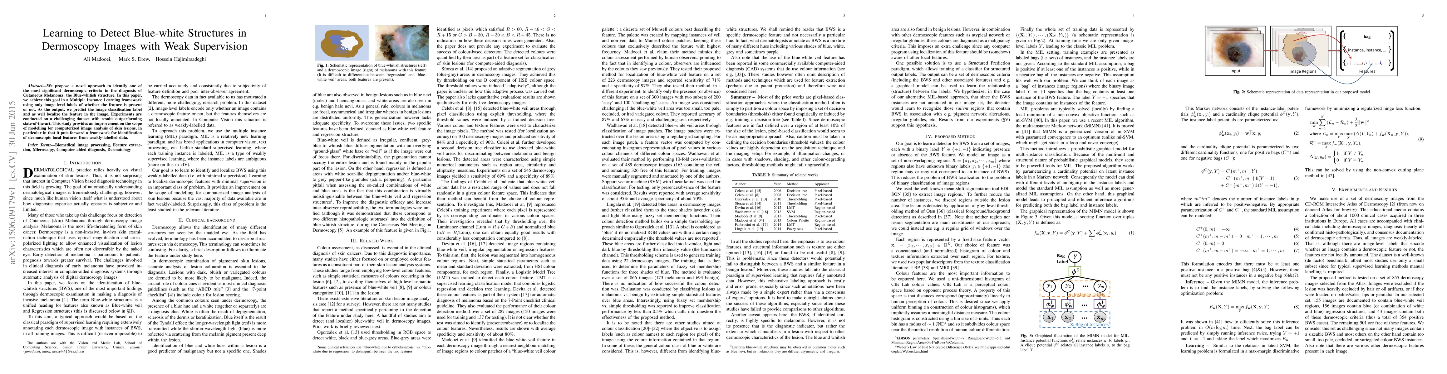 We propose a novel approach to identify one of the most significant dermoscopic criteria in the diagnosis of Cutaneous Melanoma: the Blue-whitish structure. In this paper, we achieve this goal in a Multiple Instance Learning framework using only image-level labels of whether the feature is present or not. As the output, we predict the image classification label and as well localize the feature in the image. Experiments are conducted on a challenging dataset with results outperforming state-of-the-art. This study provides an improvement on the scope of modelling for computerized image analysis of skin lesions, in particular in that it puts forward a framework for identification of dermoscopic local features from weakly-labelled data.