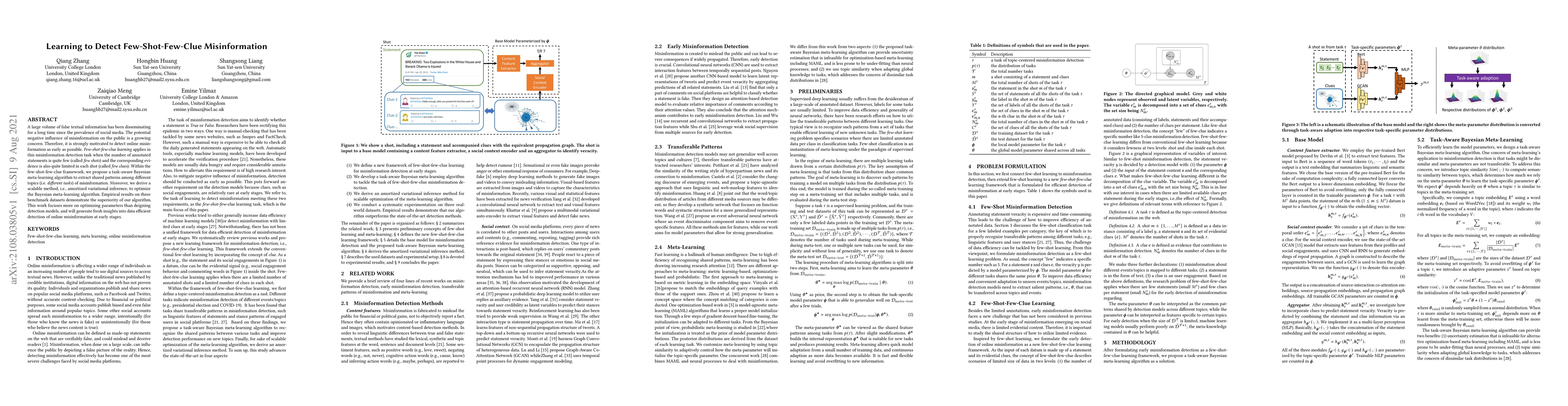 The quality of digital information on the web has been disquieting due to the lack of careful manual review. Consequently, a large volume of false textual information has been disseminating for a long time since the prevalence of social media. The potential negative influence of misinformation on the public is a growing concern. Therefore, it is strongly motivated to detect online misinformation as early as possible. Few-shot-few-clue learning applies in this misinformation detection task when the number of annotated statements is quite few (called few shots) and the corresponding evidence is also quite limited in each shot (called few clues). Within the few-shot-few-clue framework, we propose a Bayesian meta-learning algorithm to extract the shared patterns among different topics (i.e.different tasks) of misinformation. Moreover, we derive a scalable method, i.e., amortized variational inference, to optimize the Bayesian meta-learning algorithm. Empirical results on three benchmark datasets demonstrate the superiority of our algorithm. This work focuses more on optimizing parameters than designing detection models, and will generate fresh insights into data-efficient detection of online misinformation at early stages.