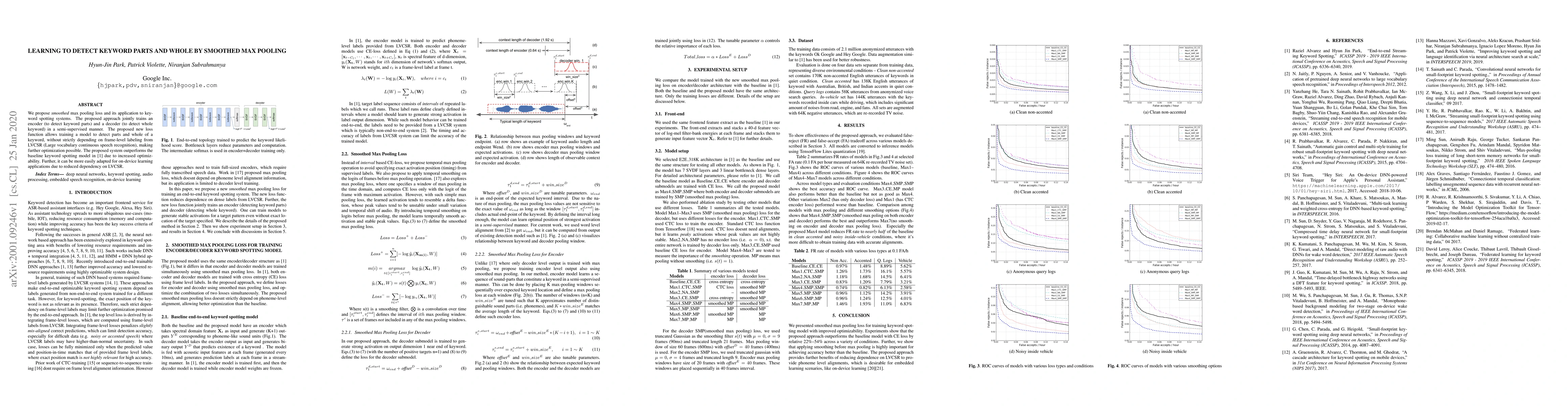 We propose smoothed max pooling loss and its application to keyword spotting systems. The proposed approach jointly trains an encoder (to detect keyword parts) and a decoder (to detect whole keyword) in a semi-supervised manner. The proposed new loss function allows training a model to detect parts and whole of a keyword, without strictly depending on frame-level labeling from LVCSR (Large vocabulary continuous speech recognition), making further optimization possible. The proposed system outperforms the baseline keyword spotting model in [1] due to increased optimizability. Further, it can be more easily adapted for on-device learning applications due to reduced dependency on LVCSR.