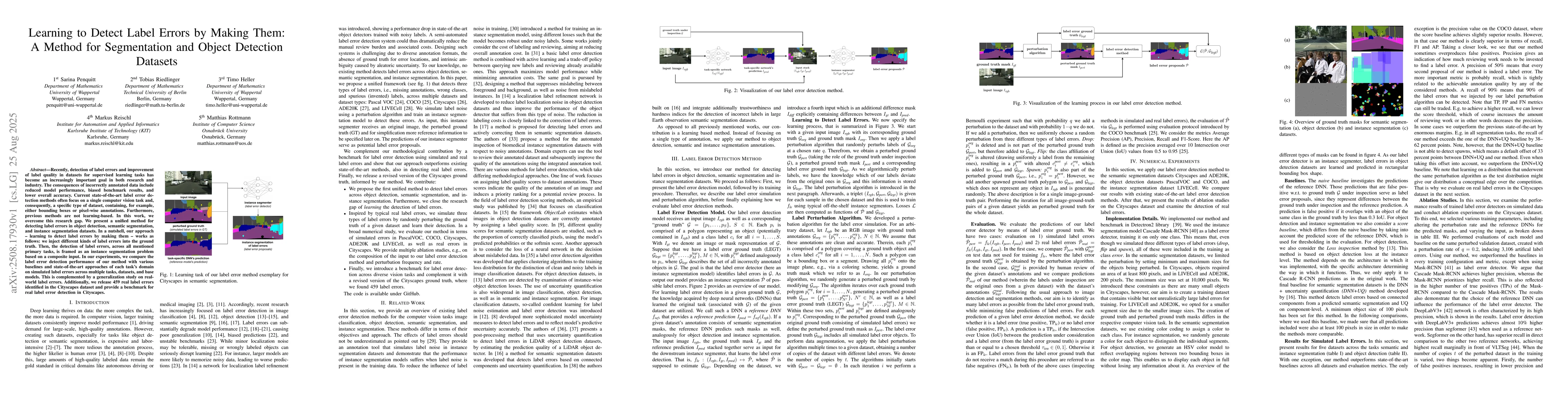 Recently, detection of label errors and improvement of label quality in datasets for supervised learning tasks has become an increasingly important goal in both research and industry. The consequences of incorrectly annotated data include reduced model performance, biased benchmark results, and lower overall accuracy. Current state-of-the-art label error detection methods often focus on a single computer vision task and, consequently, a specific type of dataset, containing, for example, either bounding boxes or pixel-wise annotations. Furthermore, previous methods are not learning-based. In this work, we overcome this research gap. We present a unified method for detecting label errors in object detection, semantic segmentation, and instance segmentation datasets. In a nutshell, our approach - learning to detect label errors by making them - works as follows: we inject different kinds of label errors into the ground truth. Then, the detection of label errors, across all mentioned primary tasks, is framed as an instance segmentation problem based on a composite input. In our experiments, we compare the label error detection performance of our method with various baselines and state-of-the-art approaches of each task's domain on simulated label errors across multiple tasks, datasets, and base models. This is complemented by a generalization study on real-world label errors. Additionally, we release 459 real label errors identified in the Cityscapes dataset and provide a benchmark for real label error detection in Cityscapes.