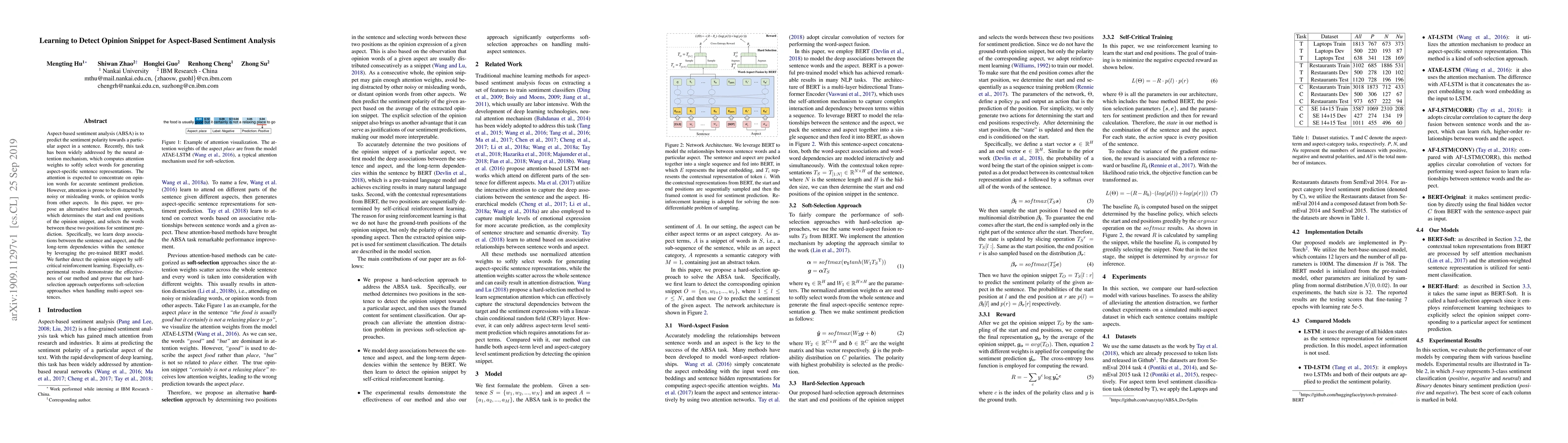 This paper proposes a hard-selection approach for aspect-based sentiment analysis, determining start and end positions of opinion snippets to select relevant words for sentiment prediction. Using BERT and self-critical reinforcement learning, the method outperforms soft-selection attention mechanisms in handling multi-aspect sentences.