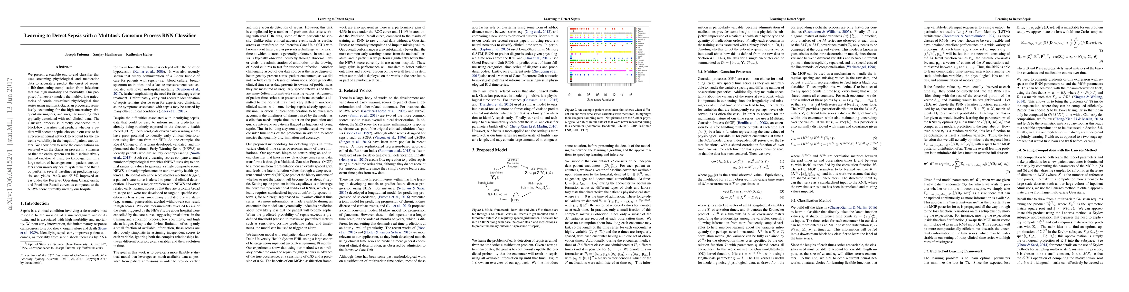 This paper proposes a scalable end-to-end classifier using multitask Gaussian processes and a recurrent neural network to predict sepsis onset from streaming physiological and medication data. The framework outperforms baselines, showing significant improvements in predictive accuracy.