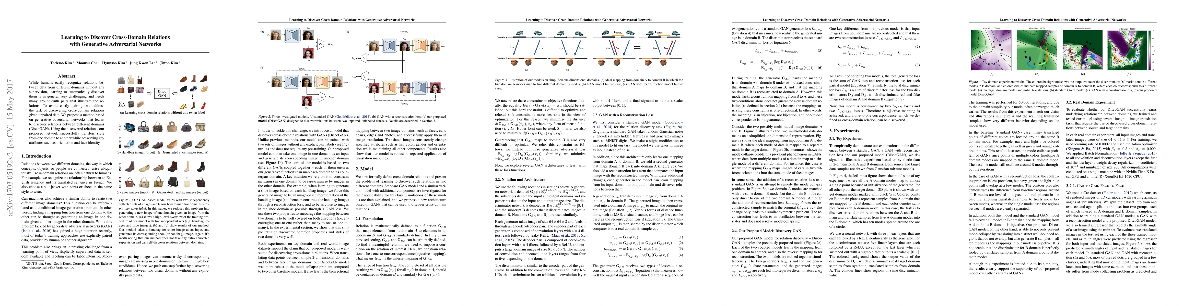 While humans easily recognize relations between data from different domains without any supervision, learning to automatically discover them is in general very challenging and needs many ground-truth pairs that illustrate the relations. To avoid costly pairing, we address the task of discovering cross-domain relations given unpaired data. We propose a method based on generative adversarial networks that learns to discover relations between different domains (DiscoGAN). Using the discovered relations, our proposed network successfully transfers style from one domain to another while preserving key attributes such as orientation and face identity. Source code for official implementation is publicly available https://github.com/SKTBrain/DiscoGAN