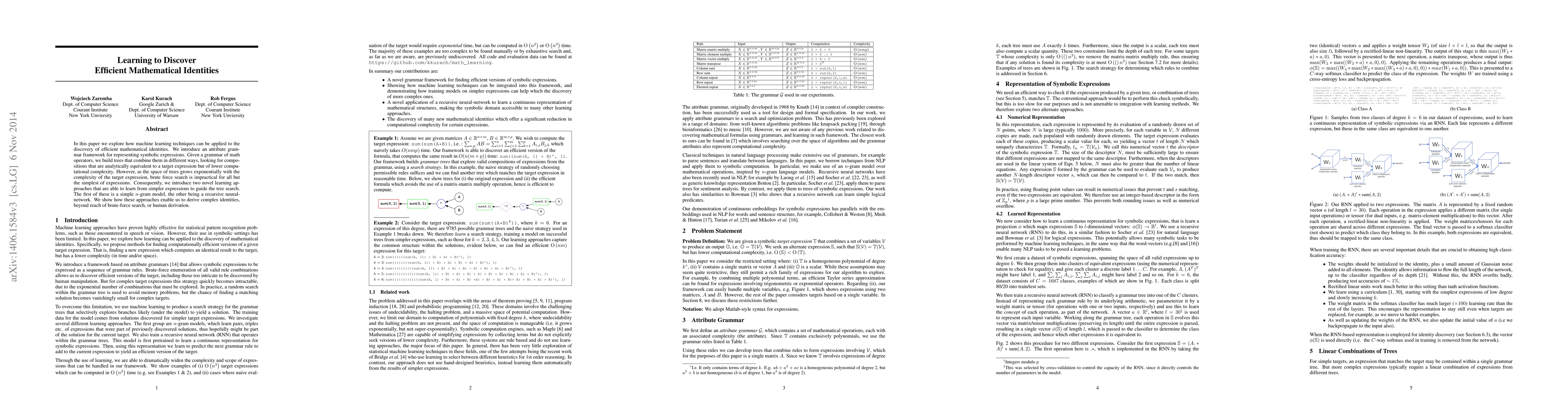 In this paper we explore how machine learning techniques can be applied to the discovery of efficient mathematical identities. We introduce an attribute grammar framework for representing symbolic expressions. Given a set of grammar rules we build trees that combine different rules, looking for branches which yield compositions that are analytically equivalent to a target expression, but of lower computational complexity. However, as the size of the trees grows exponentially with the complexity of the target expression, brute force search is impractical for all but the simplest of expressions. Consequently, we introduce two novel learning approaches that are able to learn from simpler expressions to guide the tree search. The first of these is a simple n-gram model, the other being a recursive neural-network. We show how these approaches enable us to derive complex identities, beyond reach of brute-force search, or human derivation.