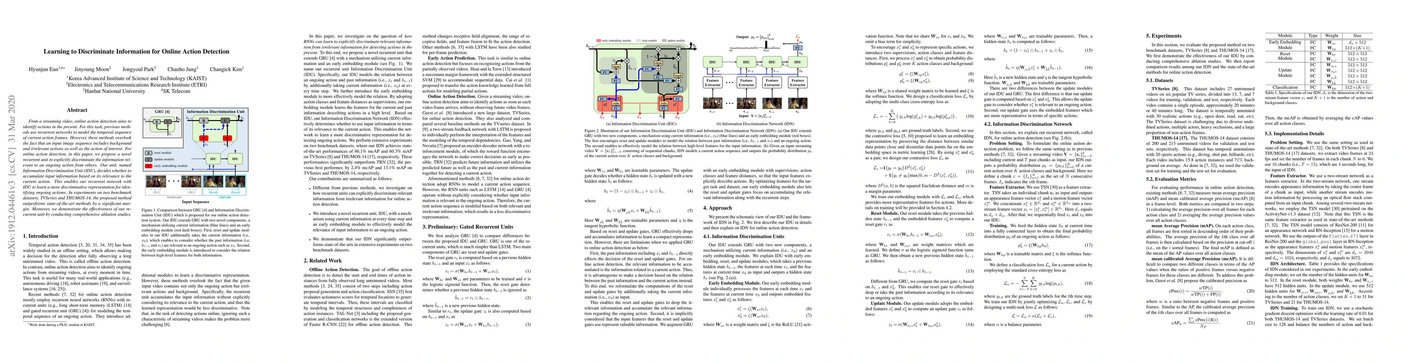 This paper proposes a novel Information Discrimination Unit (IDU) to enhance online action detection by explicitly distinguishing relevant action information from background and irrelevant actions. The IDU integrates into a recurrent network to learn more discriminative representations, outperforming state-of-the-art methods on benchmark datasets and validated through comprehensive ablation studies.