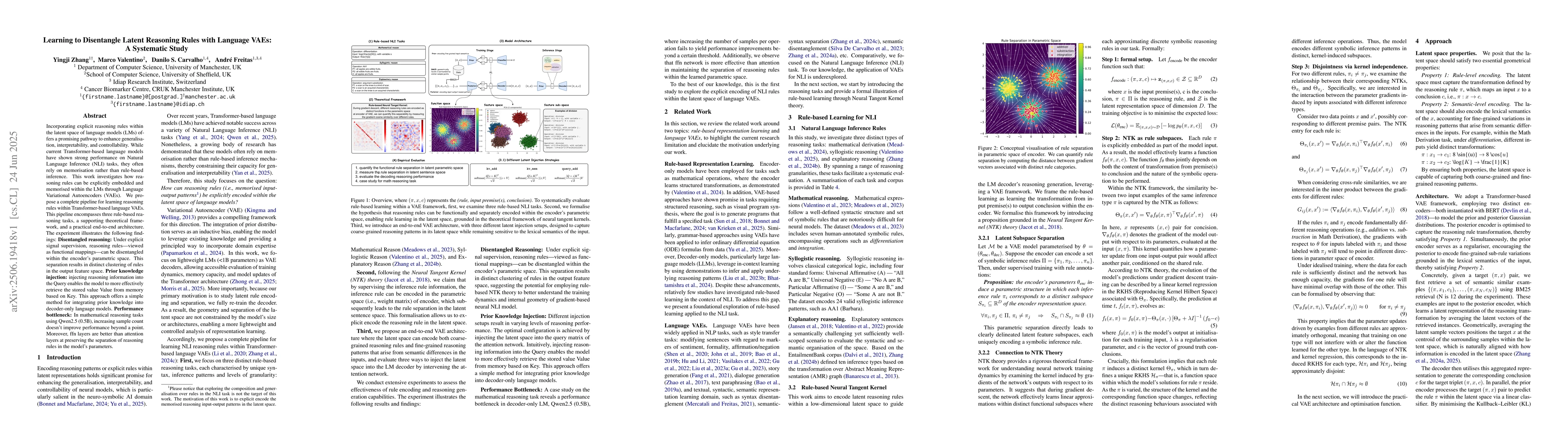This research proposes a method to embed explicit reasoning rules in Transformer-based language models using Language Variational Autoencoders (VAEs). Key findings include the disentanglement of reasoning rules in the encoder's parameter space, effective integration of prior knowledge via rule injection, and the observation that increasing samples doesn't significantly improve performance in mathematical reasoning tasks, with feed-forward layers better preserving rule separation than attention layers.
