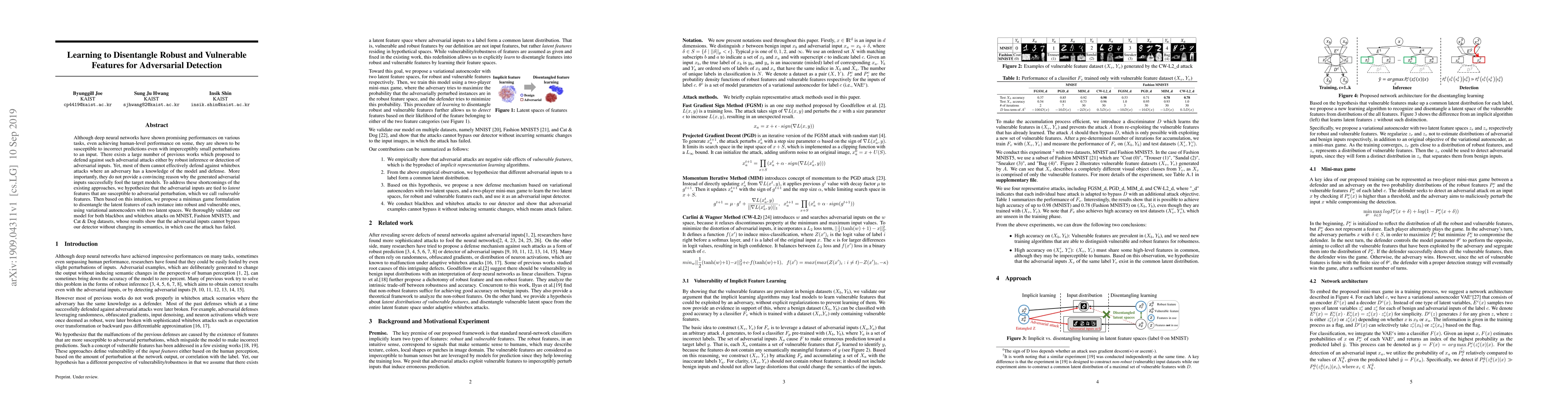 Although deep neural networks have shown promising performances on various tasks, even achieving human-level performance on some, they are shown to be susceptible to incorrect predictions even with imperceptibly small perturbations to an input. There exists a large number of previous works which proposed to defend against such adversarial attacks either by robust inference or detection of adversarial inputs. Yet, most of them cannot effectively defend against whitebox attacks where an adversary has a knowledge of the model and defense. More importantly, they do not provide a convincing reason why the generated adversarial inputs successfully fool the target models. To address these shortcomings of the existing approaches, we hypothesize that the adversarial inputs are tied to latent features that are susceptible to adversarial perturbation, which we call vulnerable features. Then based on this intuition, we propose a minimax game formulation to disentangle the latent features of each instance into robust and vulnerable ones, using variational autoencoders with two latent spaces. We thoroughly validate our model for both blackbox and whitebox attacks on MNIST, Fashion MNIST5, and Cat & Dog datasets, whose results show that the adversarial inputs cannot bypass our detector without changing its semantics, in which case the attack has failed.