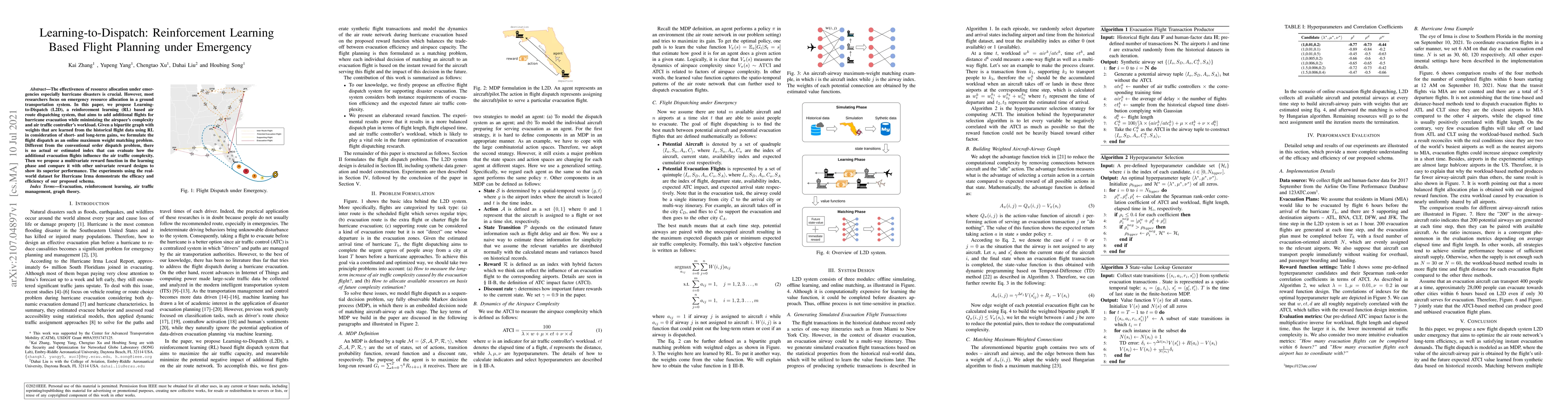 This paper proposes Learning-to-Dispatch (L2D), a reinforcement learning-based system for optimizing air route dispatching during hurricane evacuations, aiming to minimize airspace complexity and controller workload. The authors introduce a multivariate reward function to enhance performance compared to univariate approaches, validated by real-world data from Hurricane Irma.
