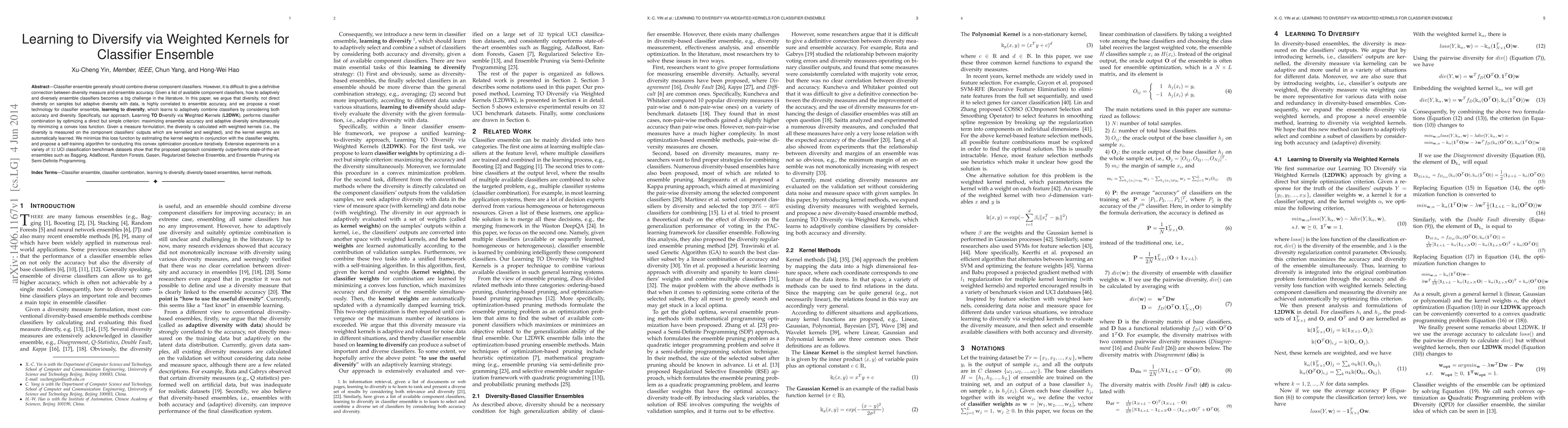 This paper proposes a novel method, Learning TO Diversify via Weighted Kernels (L2DWK), to adaptively combine classifiers by optimizing both ensemble accuracy and adaptive diversity. The approach uses weighted kernels to measure diversity based on classifier outputs, and a self-training algorithm to iteratively minimize a convex loss function, outperforming state-of-the-art ensemble methods on 32 UCI datasets.