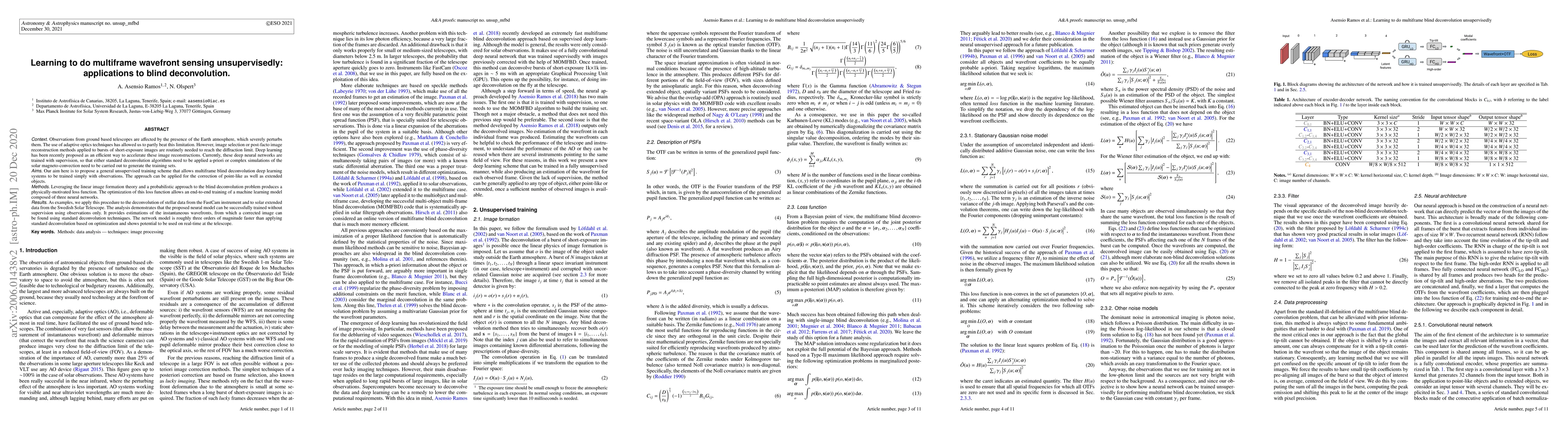 Observations from ground based telescopes are affected by the presence of the Earth atmosphere, which severely perturbs them. The use of adaptive optics techniques has allowed us to partly beat this limitation. However, image selection or post-facto image reconstruction methods applied to bursts of short-exposure images are routinely needed to reach the diffraction limit. Deep learning has been recently proposed as an efficient way to accelerate these image reconstructions. Currently, these deep neural networks are trained with supervision, so that either standard deconvolution algorithms need to be applied a-priori or complex simulations of the solar magneto-convection need to be carried out to generate the training sets. Our aim here is to propose a general unsupervised training scheme that allows multiframe blind deconvolution deep learning systems to be trained simply with observations. The approach can be applied for the correction of point-like as well as extended objects. Leveraging the linear image formation theory and a probabilistic approach to the blind deconvolution problem produces a physically-motivated loss function. The optimization of this loss function allows an end-to-end training of a machine learning model composed of three neural networks. As examples, we apply this procedure to the deconvolution of stellar data from the FastCam instrument and to solar extended data from the Swedish Solar Telescope. The analysis demonstrates that the proposed neural model can be successfully trained without supervision using observations only. It provides estimations of the instantaneous wavefronts, from which a corrected image can be found using standard deconvolution technniques. The network model is roughly three orders of magnitude faster than applying standard deconvolution based on optimization and shows potential to be used on real-time at the telescope.