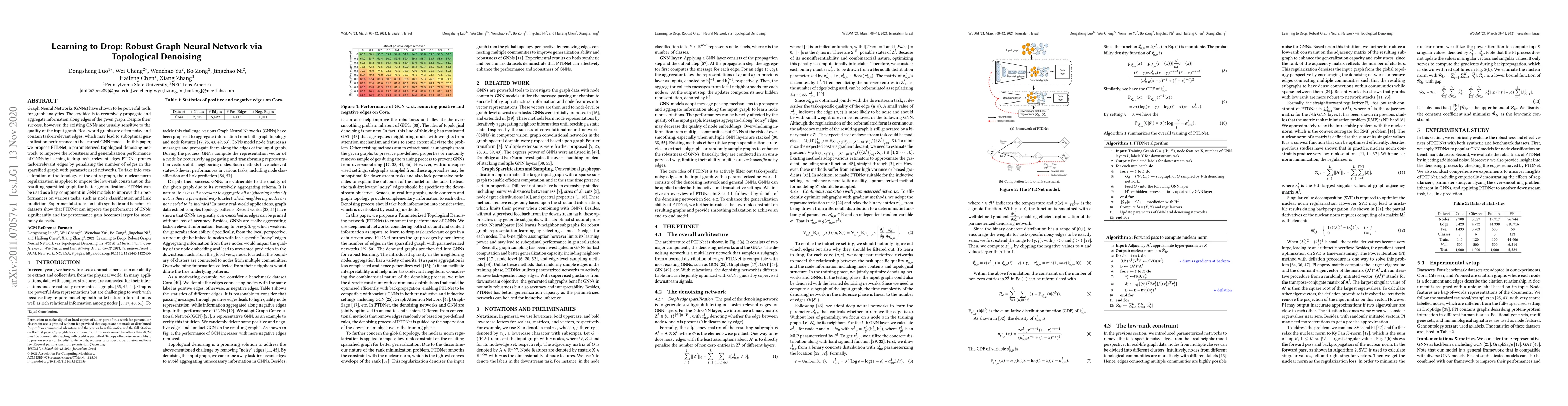 This paper proposes PTDNet, a topological denoising network that enhances the robustness of Graph Neural Networks (GNNs) by learning to drop task-irrelevant edges. It employs parameterized networks and nuclear norm regularization to sparsify the graph, improving generalization performance on tasks like node classification and link prediction.