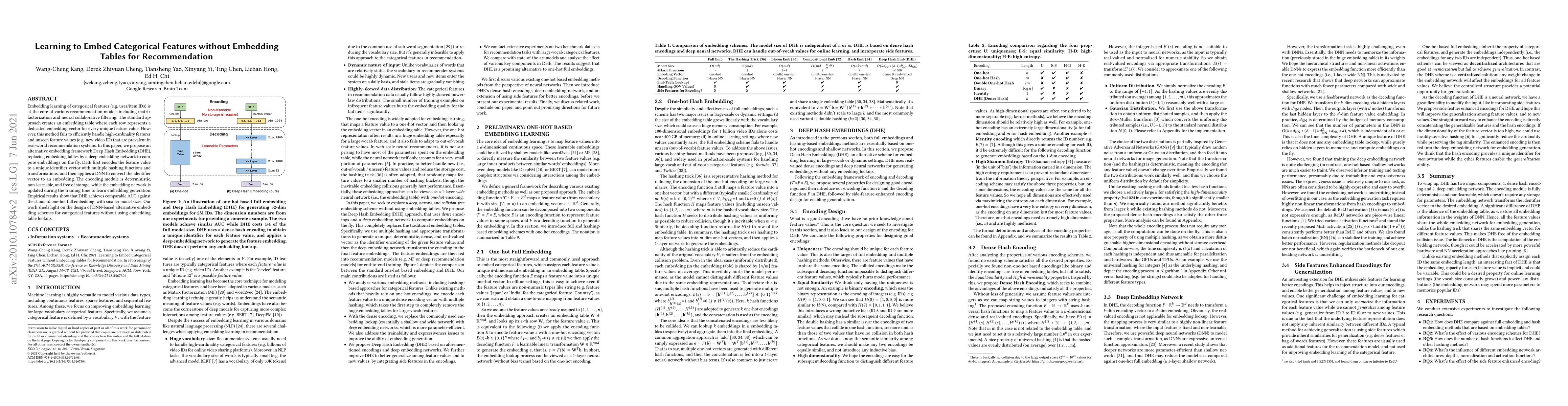 This paper proposes Deep Hash Embedding (DHE) to efficiently embed high-cardinality categorical features in recommendation systems, replacing traditional embedding tables with a deep network that computes embeddings on the fly. DHE uses hashing and transformations to generate identifier vectors, which are then embedded by a trainable deep neural network, achieving comparable performance with smaller model sizes.