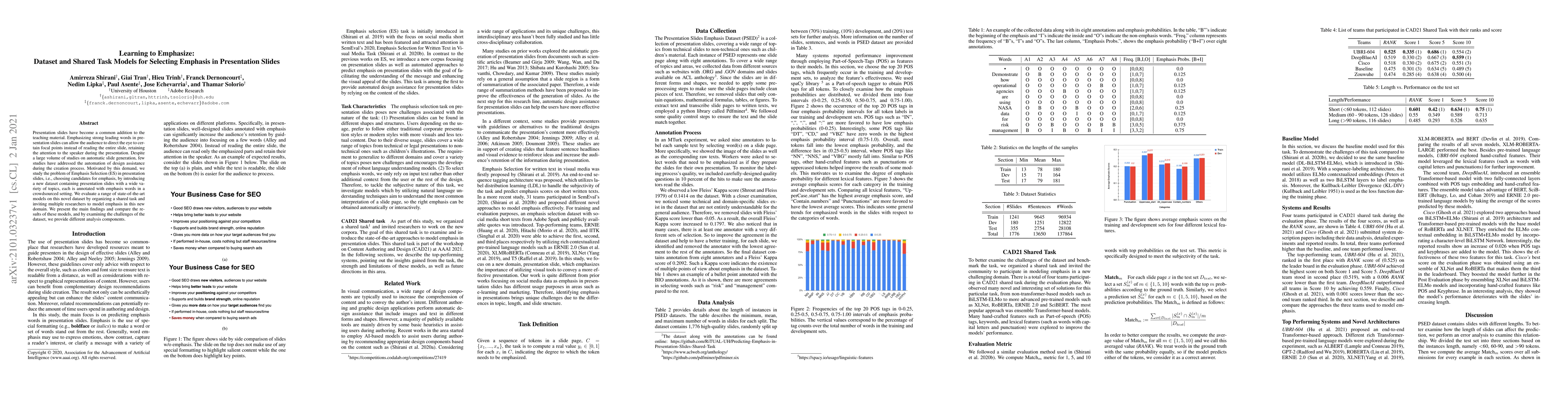 This paper introduces a new dataset for studying Emphasis Selection (ES) in presentation slides, where emphasis words are crowdsourced. It organizes a shared task to evaluate various models on this dataset, presenting findings and challenges to advance research in automating design assistance for presentation slides.