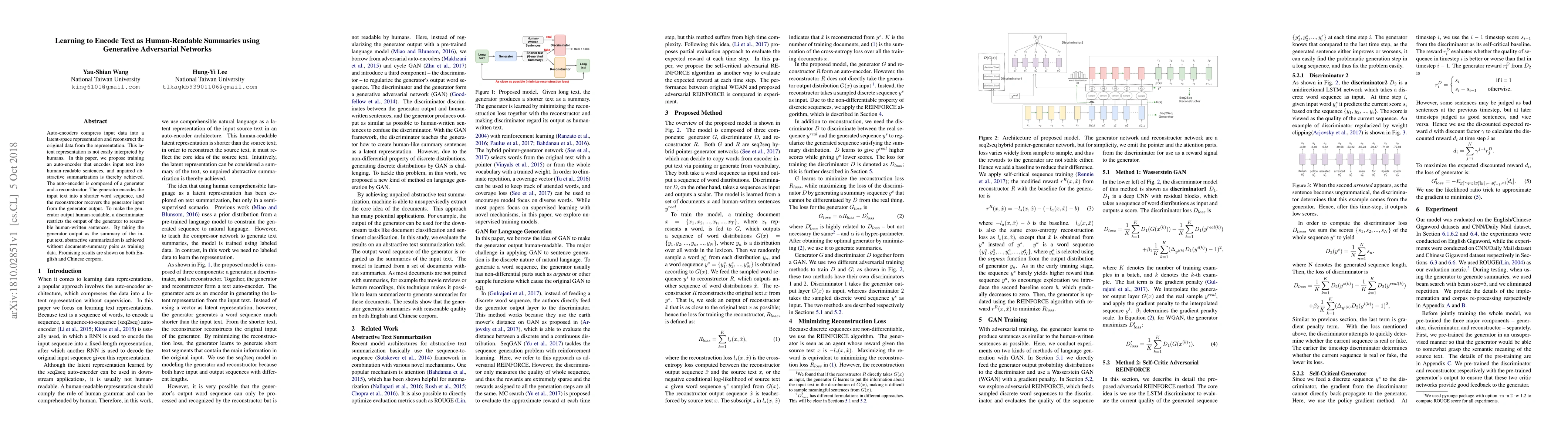 This paper proposes using generative adversarial networks to train an auto-encoder that encodes text into human-readable summaries without requiring paired training data, achieving promising results on English and Chinese corpora.
