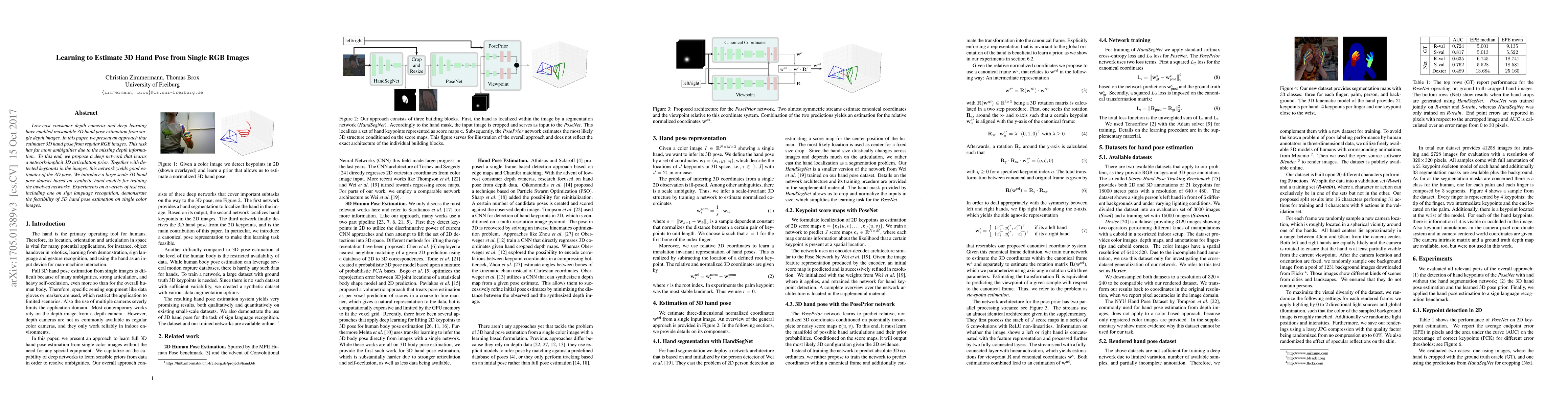 The paper presents a deep network approach to estimate 3D hand pose from single RGB images, utilizing a network-implicit 3D articulation prior along with detected keypoints. A large-scale synthetic hand pose dataset is introduced for training the involved networks.