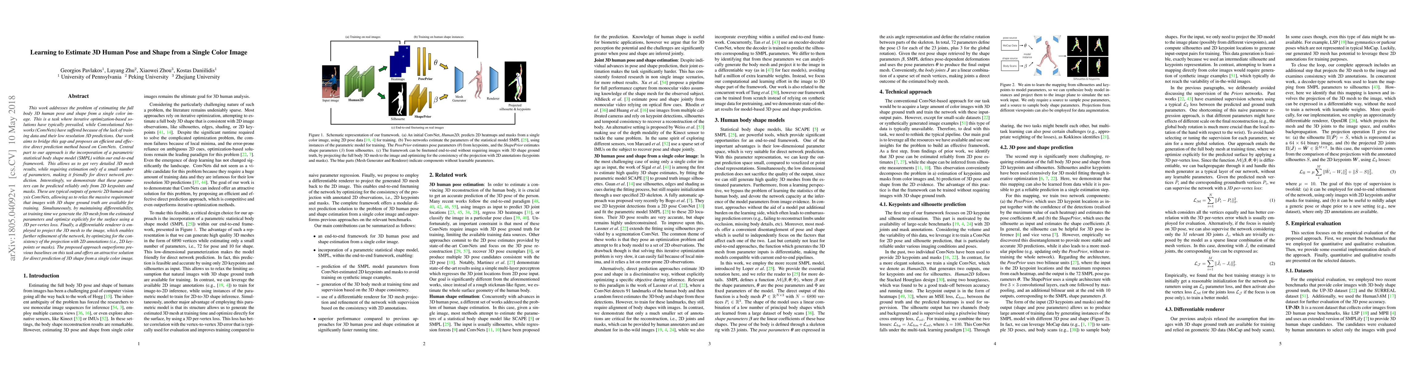 This paper proposes a direct convolutional network method for estimating 3D human pose and shape from a single color image, leveraging a parametric statistical body model (SMPL) and differentiable rendering to achieve detailed 3D mesh results with fewer parameters, outperforming previous iterative optimization-based solutions.