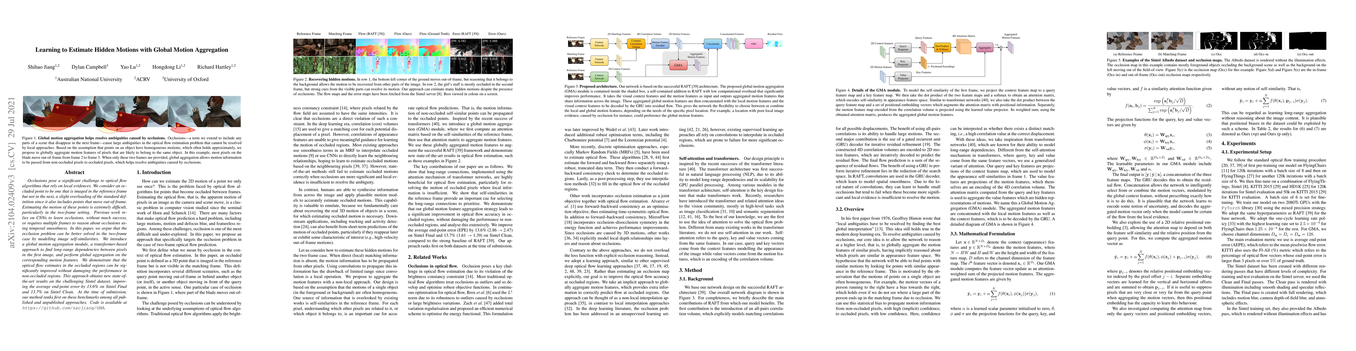 This paper proposes a global motion aggregation module using transformer-based techniques to estimate hidden motions in occluded regions, significantly improving optical flow estimates in challenging scenarios. The method achieves state-of-the-art results on the Sintel dataset, reducing average end-point error by 13.6% on Sintel Final and 13.7% on Sintel Clean.