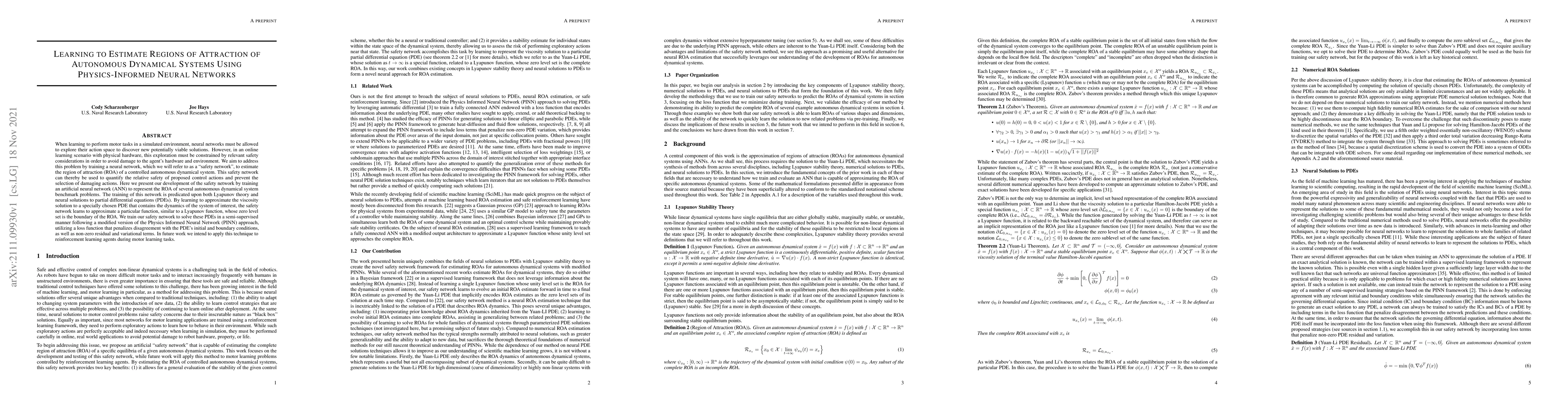 When learning to perform motor tasks in a simulated environment, neural networks must be allowed to explore their action space to discover new potentially viable solutions. However, in an online learning scenario with physical hardware, this exploration must be constrained by relevant safety considerations in order to avoid damage to the agent's hardware and environment. We aim to address this problem by training a neural network, which we will refer to as a "safety network", to estimate the region of attraction (ROA) of a controlled autonomous dynamical system. This safety network can thereby be used to quantify the relative safety of proposed control actions and prevent the selection of damaging actions. Here we present our development of the safety network by training an artificial neural network (ANN) to represent the ROA of several autonomous dynamical system benchmark problems. The training of this network is predicated upon both Lyapunov theory and neural solutions to partial differential equations (PDEs). By learning to approximate the viscosity solution to a specially chosen PDE that contains the dynamics of the system of interest, the safety network learns to approximate a particular function, similar to a Lyapunov function, whose zero level set is boundary of the ROA. We train our safety network to solve these PDEs in a semi-supervised manner following a modified version of the Physics Informed Neural Network (PINN) approach, utilizing a loss function that penalizes disagreement with the PDE's initial and boundary conditions, as well as non-zero residual and variational terms. In future work we intend to apply this technique to reinforcement learning agents during motor learning tasks.