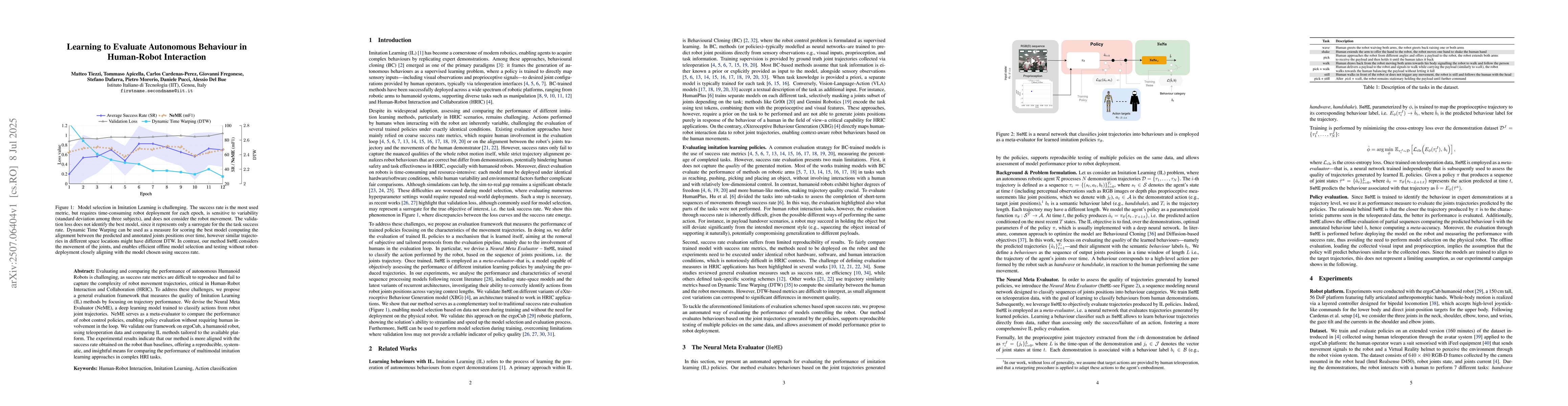 Evaluating and comparing the performance of autonomous Humanoid Robots is challenging, as success rate metrics are difficult to reproduce and fail to capture the complexity of robot movement trajectories, critical in Human-Robot Interaction and Collaboration (HRIC). To address these challenges, we propose a general evaluation framework that measures the quality of Imitation Learning (IL) methods by focusing on trajectory performance. We devise the Neural Meta Evaluator (NeME), a deep learning model trained to classify actions from robot joint trajectories. NeME serves as a meta-evaluator to compare the performance of robot control policies, enabling policy evaluation without requiring human involvement in the loop. We validate our framework on ergoCub, a humanoid robot, using teleoperation data and comparing IL methods tailored to the available platform. The experimental results indicate that our method is more aligned with the success rate obtained on the robot than baselines, offering a reproducible, systematic, and insightful means for comparing the performance of multimodal imitation learning approaches in complex HRI tasks.