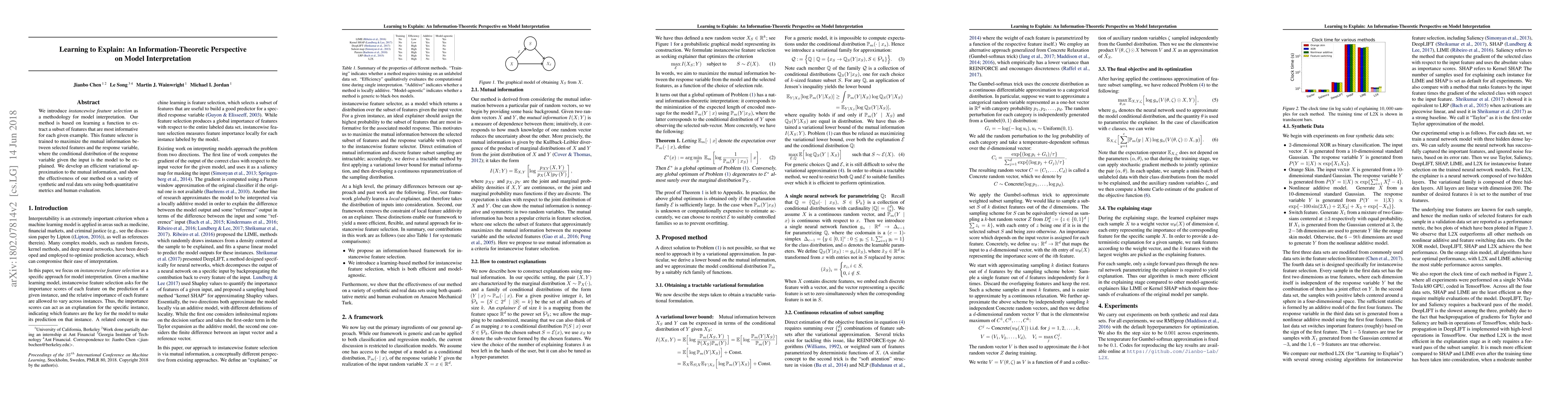 This research introduces an information-theoretic method for model interpretation called instancewise feature selection, which trains a feature selector to maximize mutual information between features and the response variable, effectively explaining how models work.