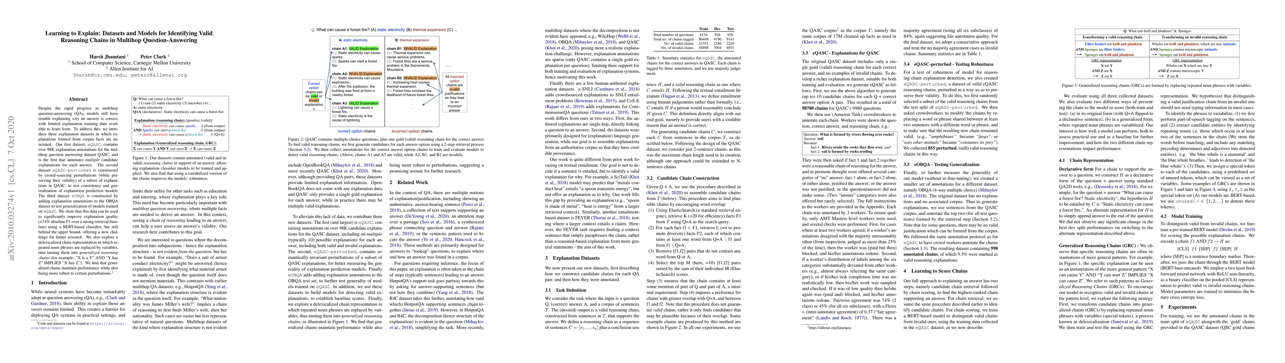 Despite the rapid progress in multihop question-answering (QA), models still have trouble explaining why an answer is correct, with limited explanation training data available to learn from. To address this, we introduce three explanation datasets in which explanations formed from corpus facts are annotated. Our first dataset, eQASC, contains over 98K explanation annotations for the multihop question answering dataset QASC, and is the first that annotates multiple candidate explanations for each answer. The second dataset eQASC-perturbed is constructed by crowd-sourcing perturbations (while preserving their validity) of a subset of explanations in QASC, to test consistency and generalization of explanation prediction models. The third dataset eOBQA is constructed by adding explanation annotations to the OBQA dataset to test generalization of models trained on eQASC. We show that this data can be used to significantly improve explanation quality (+14% absolute F1 over a strong retrieval baseline) using a BERT-based classifier, but still behind the upper bound, offering a new challenge for future research. We also explore a delexicalized chain representation in which repeated noun phrases are replaced by variables, thus turning them into generalized reasoning chains (for example: "X is a Y" AND "Y has Z" IMPLIES "X has Z"). We find that generalized chains maintain performance while also being more robust to certain perturbations.